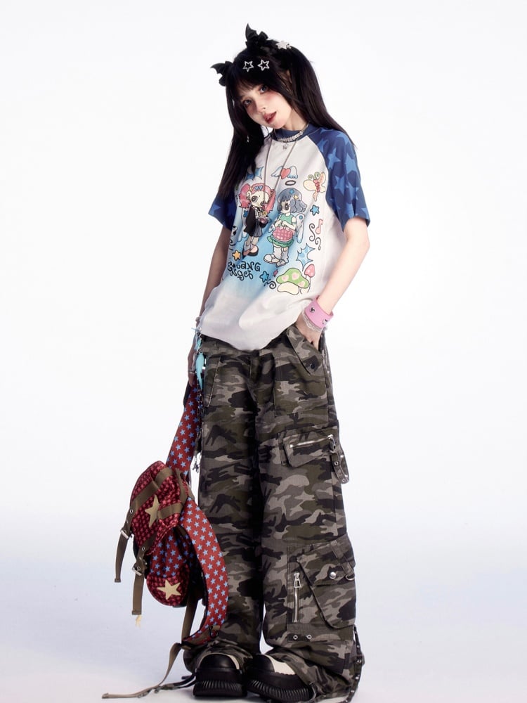 青と白のカラーブロックデザイン Y2K 漫画ガールプリント Tシャツ