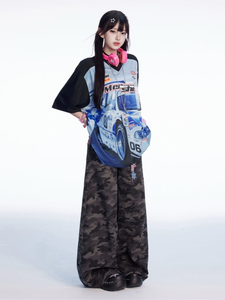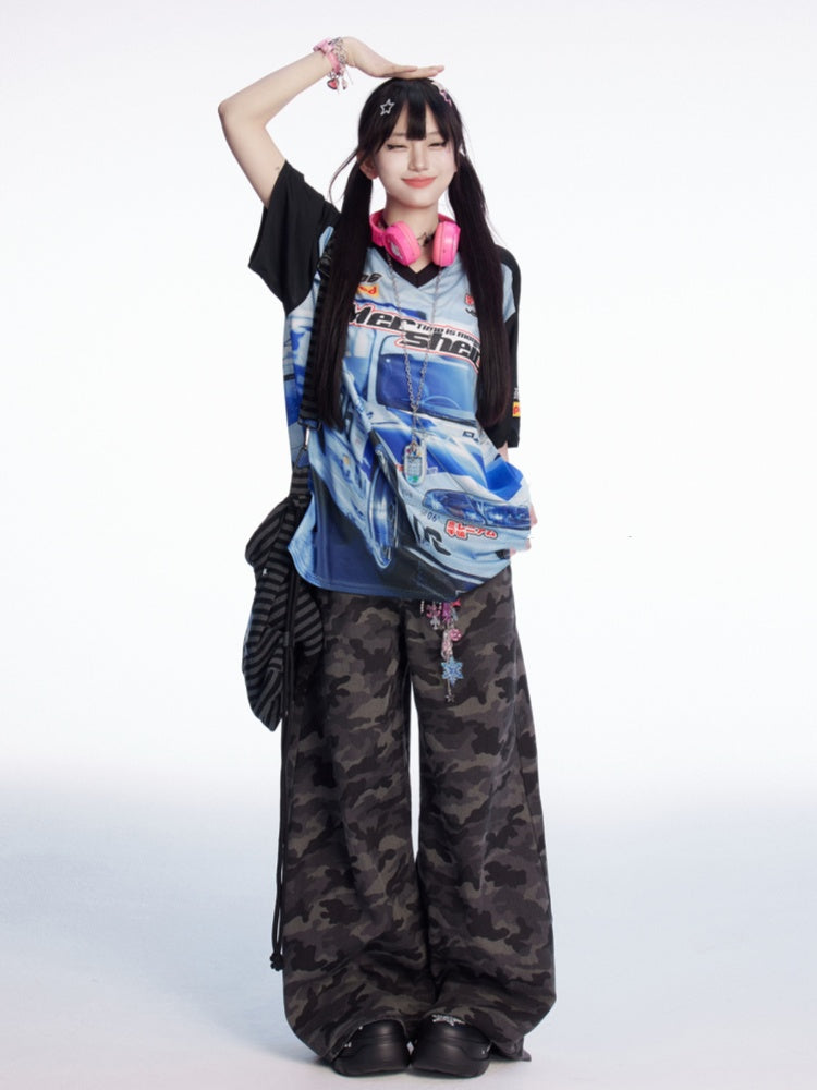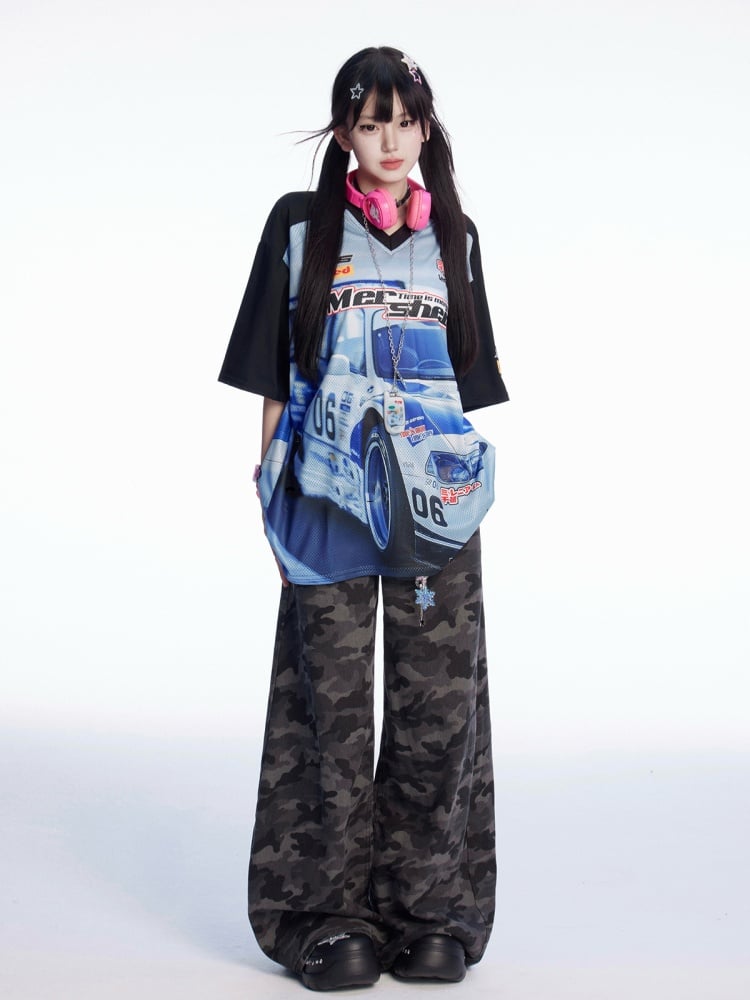 ブルーブラックとTシャツカラーブロックVネックレーシングプリントルーズデザイン