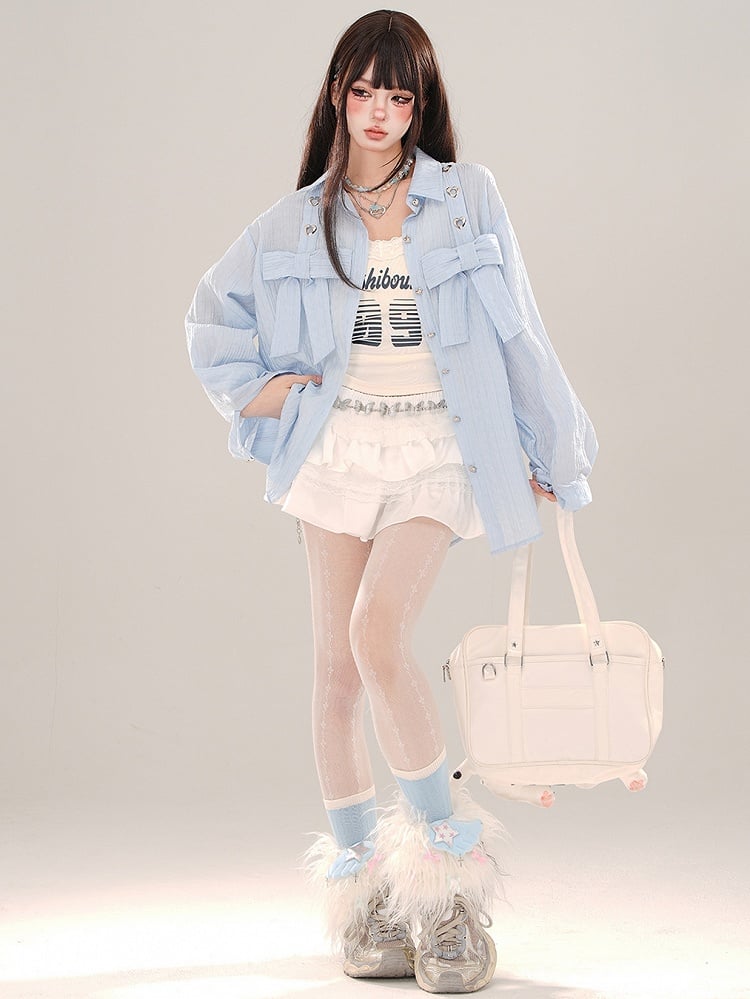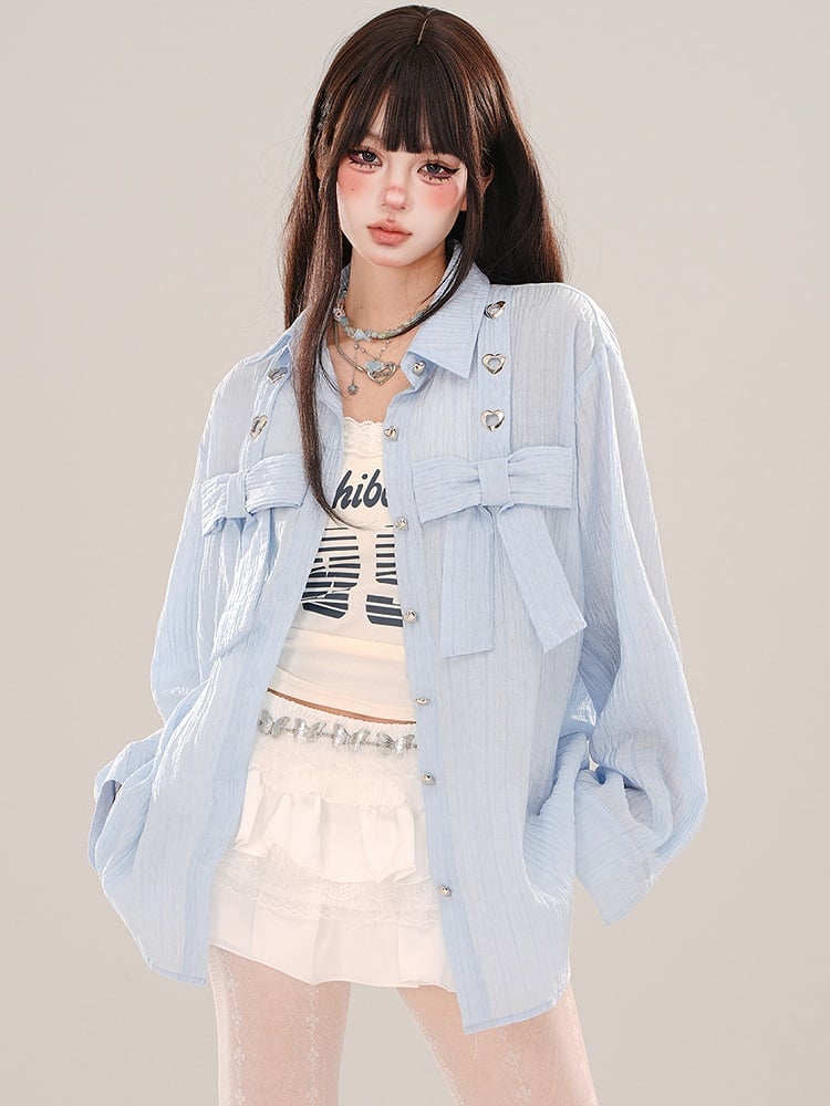 ブルーのリボンディテールが映えるルーズシャツで、スタイリッシュに着こなしましょう。愛らしいリボンがコーディネートにキュートなアクセントを添えます。ゆったりとしたフィット感で着心地も良く、シックな印象も叶えます。どんなシーンにもぴったりです!