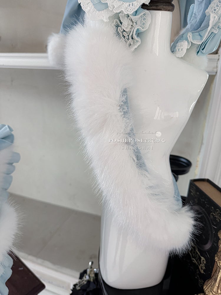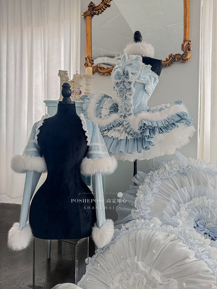 ブルーのバニーイヤー、蝶結びボディス、レイヤードスカート、ボーン入りドレス + クロップドケープトップセット