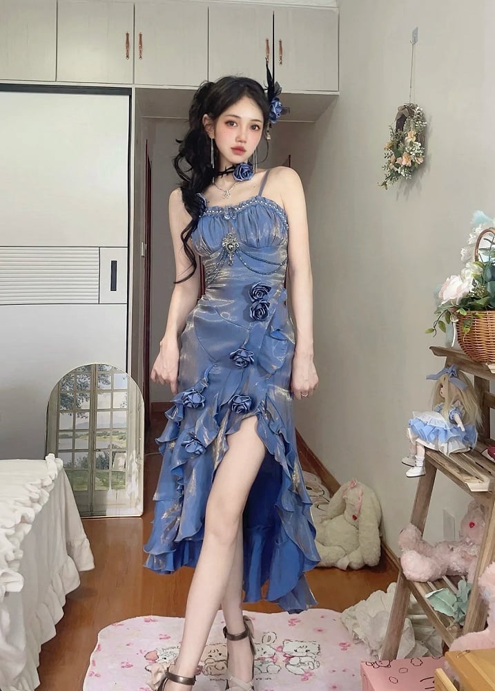 取り外し可能なフリル袖付きブルーのイブニングドレス、ロゼットマーメイドドレス