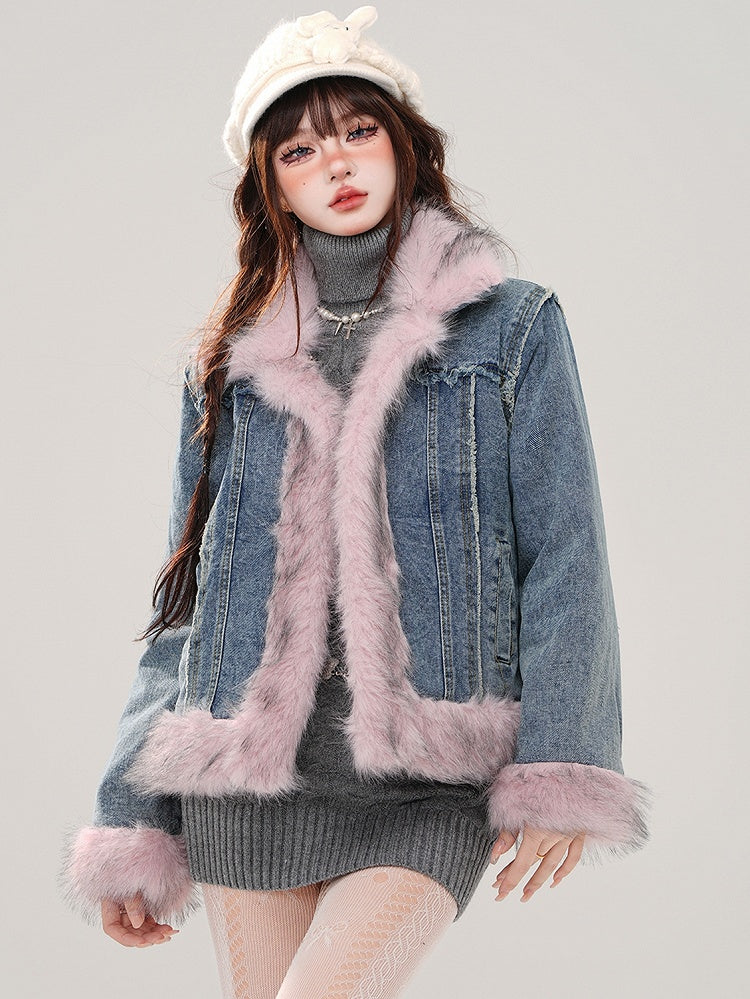 この愛らしいジャケットは、暖かさとスタイリッシュさを兼ね備えた、ふわふわのブルーのフェイクファーの裏地付き。厚手のデニム素材は耐久性と快適性を兼ね備えています。この素敵なアウターで、心地よくキュートな装いを演出しましょう。