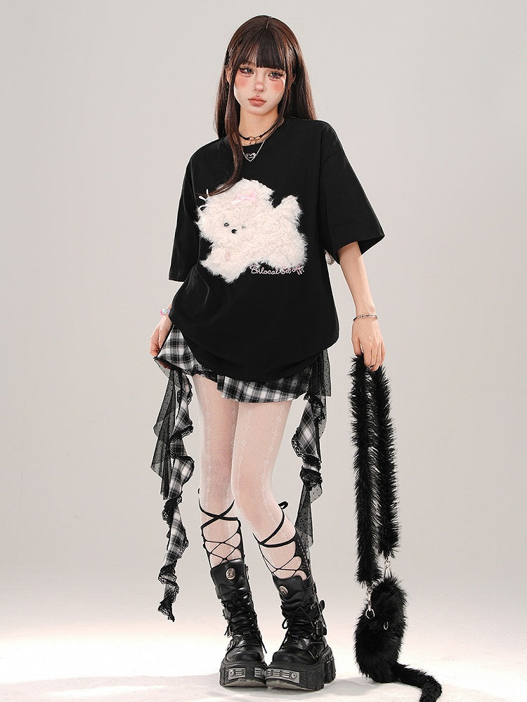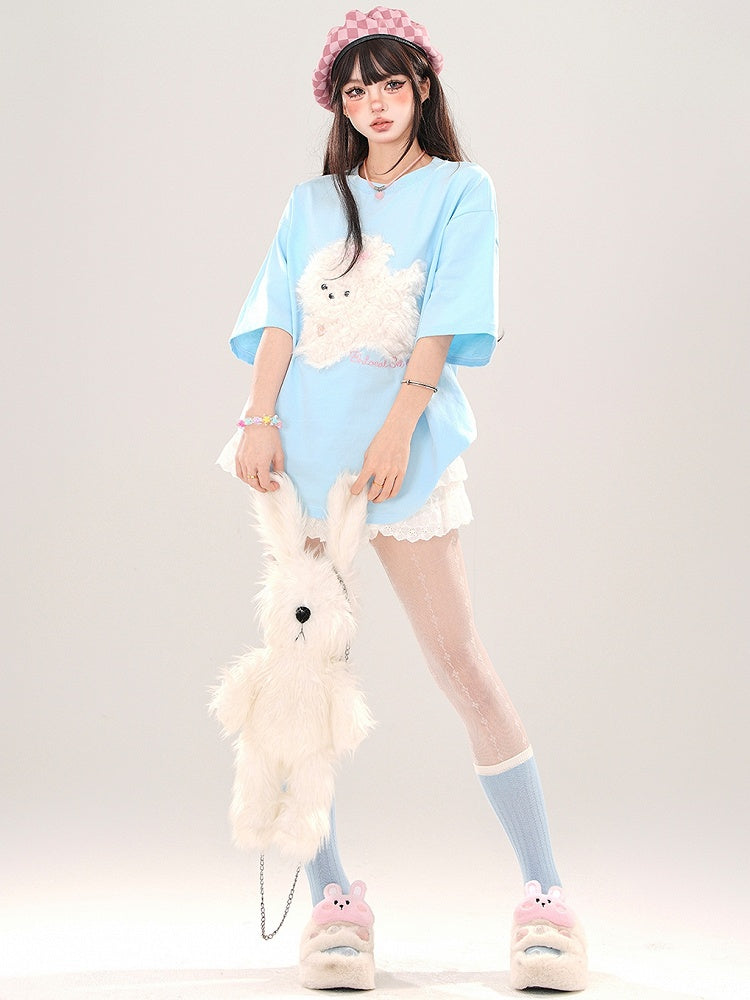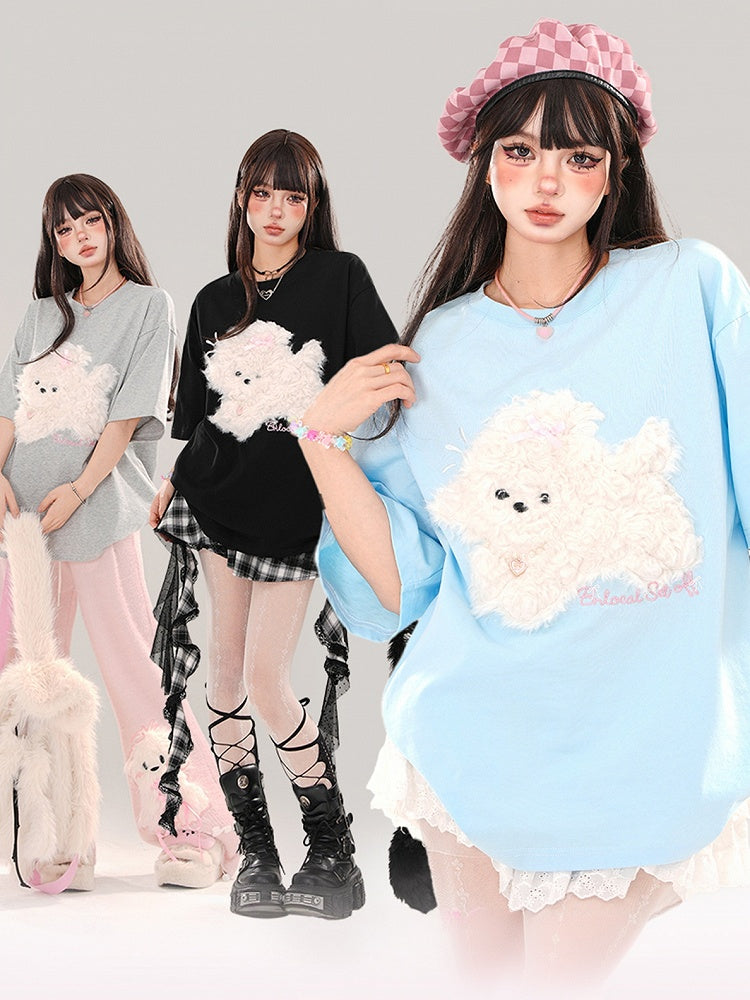 ブルー/グレー/ブラック ぬいぐるみパピーアップリケ ルーズTシャツ