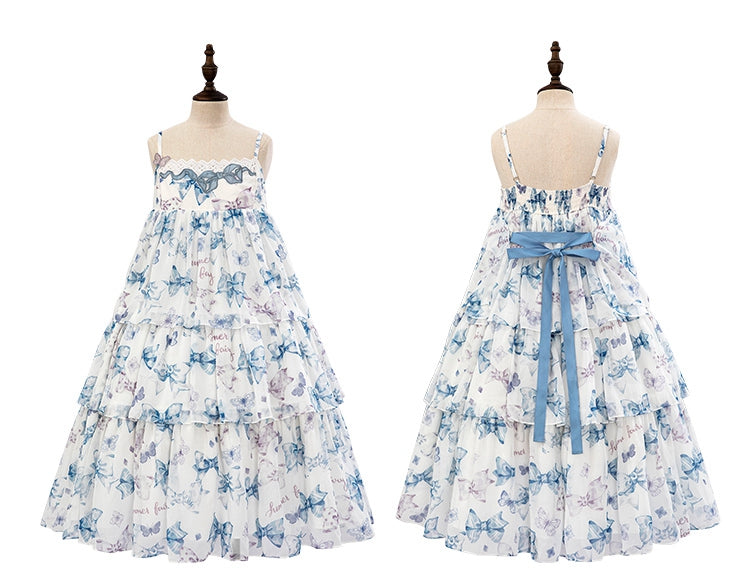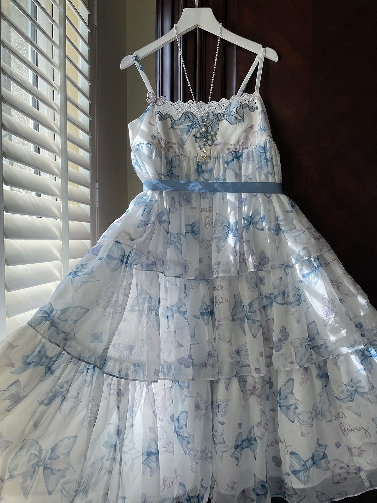 ブルーのハイウエストリボンプリントティアードスカート サマーロリータドレス