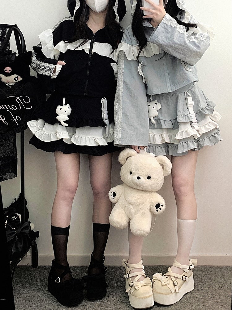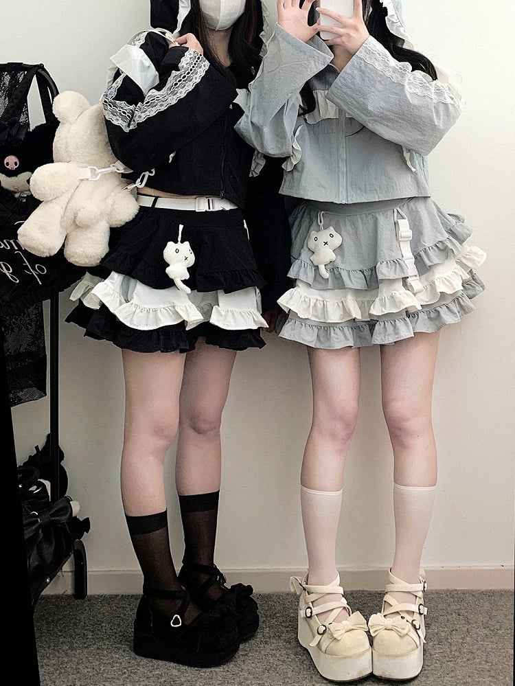 ブルーのJirai Kei Techwearキュートなキティ柄ティアードフリルスカートで、さりげないキュートさをコーディネートにプラス。ブルーのカラーとティアードフリルが遊び心とチャーミングさをプラスし、キティ柄のディテールがユニークで愛らしい雰囲気を演出します。このスカートでスタイリッシュに、そして可愛らしく過ごしましょう。
