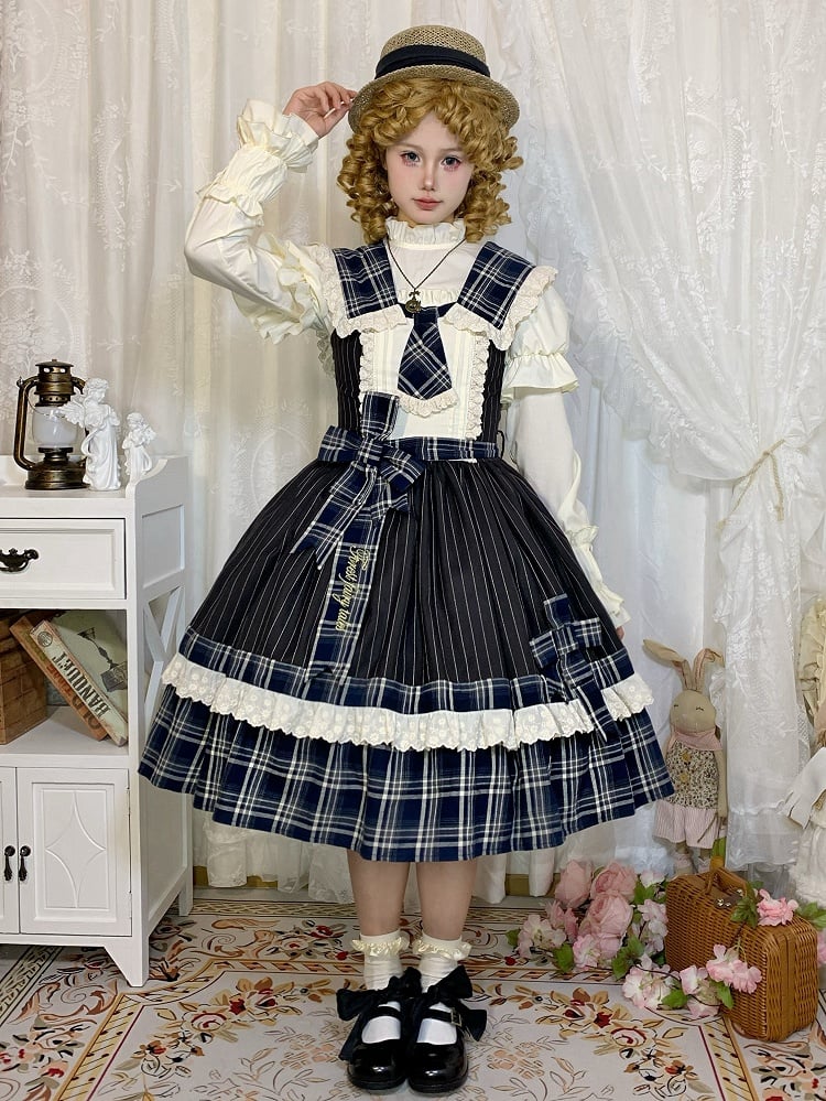 ブルーのチェック柄とブラックのストライプ柄ドレス、取り外し可能な襟とネクタイ付きロリータジャンパースカート