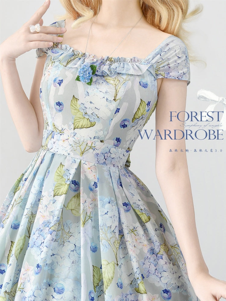 ブルーベリーと花柄のブルージャンパースカートドレス