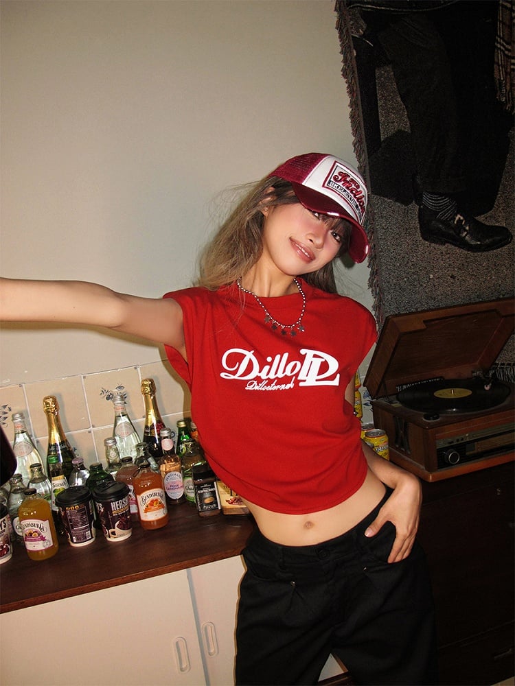 Red Crop Top with Bold White Letter Print & Structured Shoulder Pads