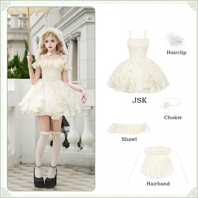 骨組みドレススカートカスケーディングベージュフリルクラシックバージョンショートバスクセットウエストロリータフル