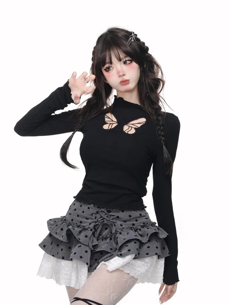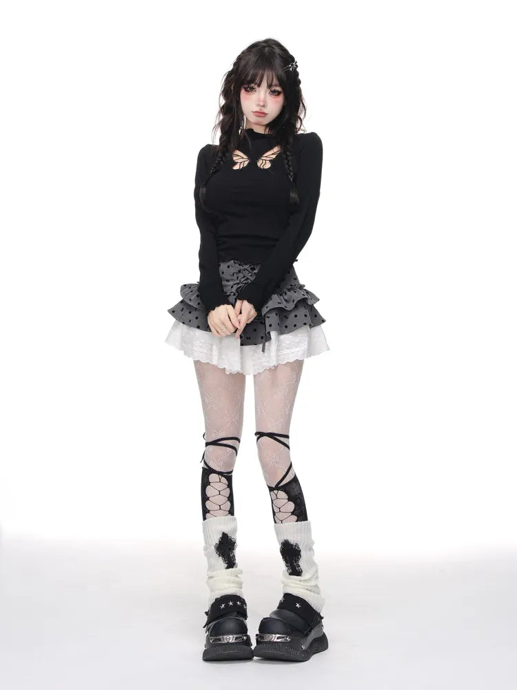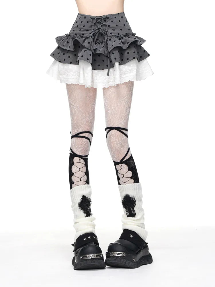 蝶結びの水玉模様のグレーのレースアップスカートのパターンと白いティアードディテール