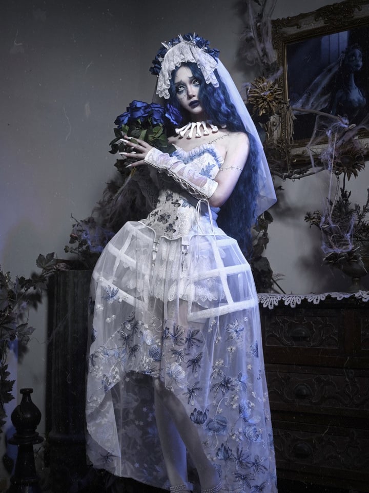 花嫁用ホワイトハイローチュールスカート、ブルーブラックフローラル刺繍