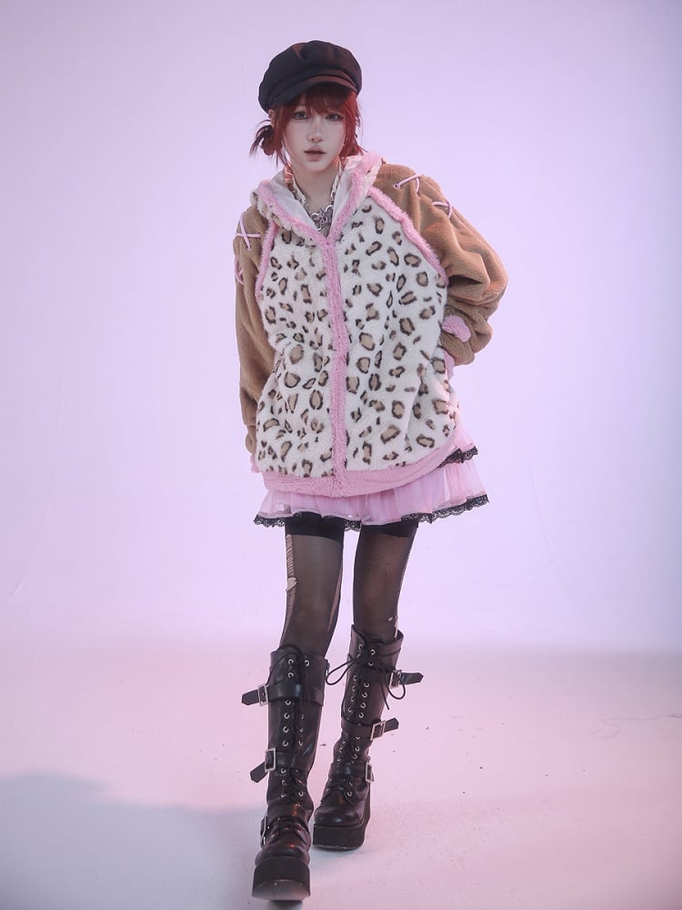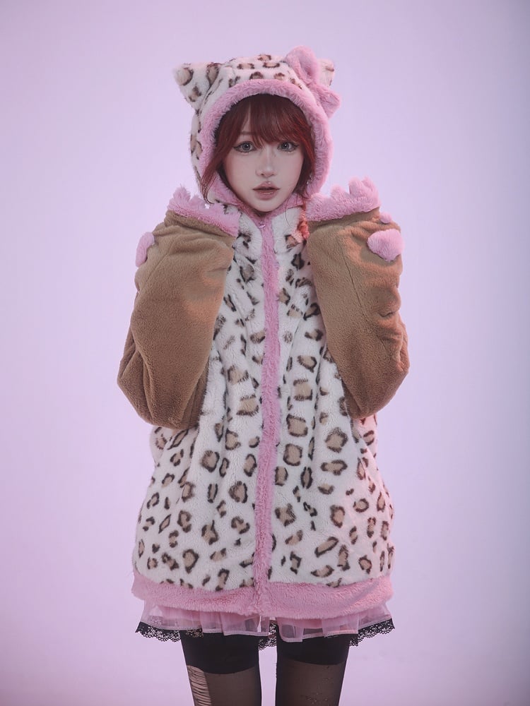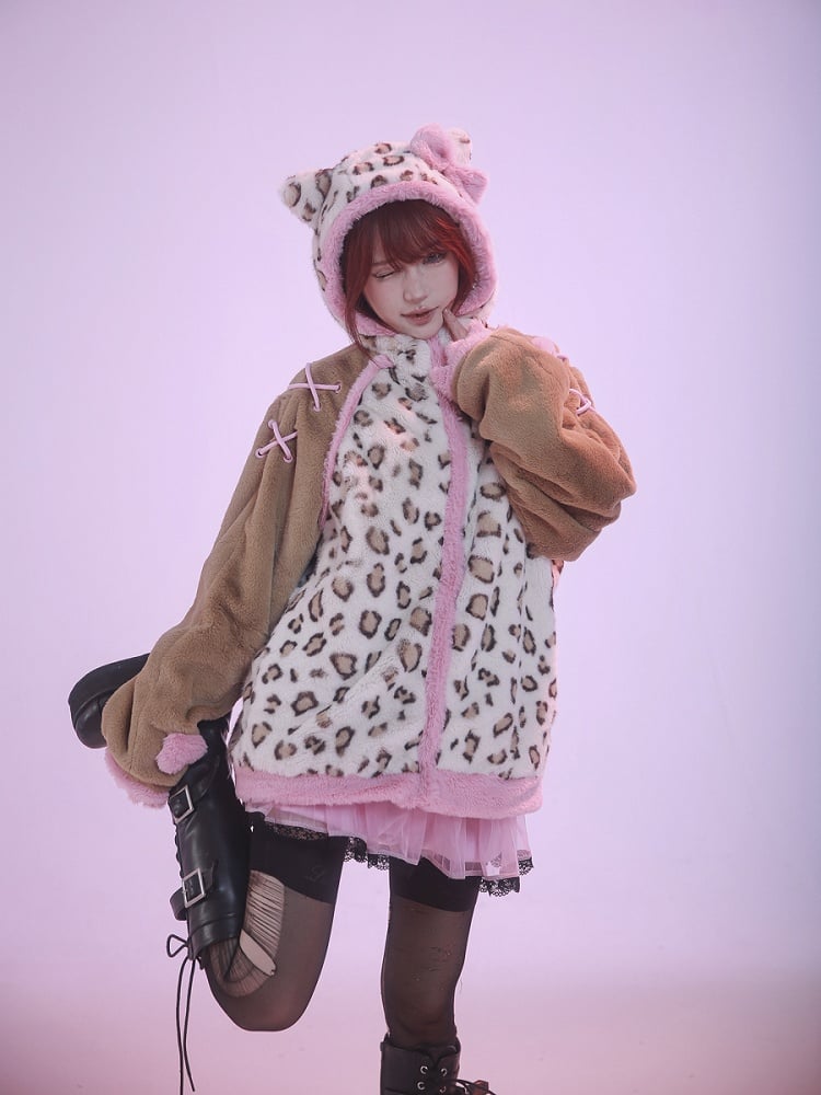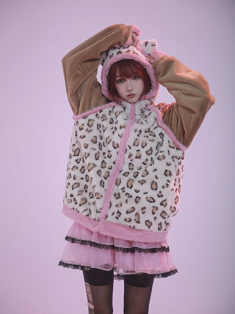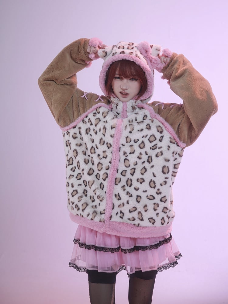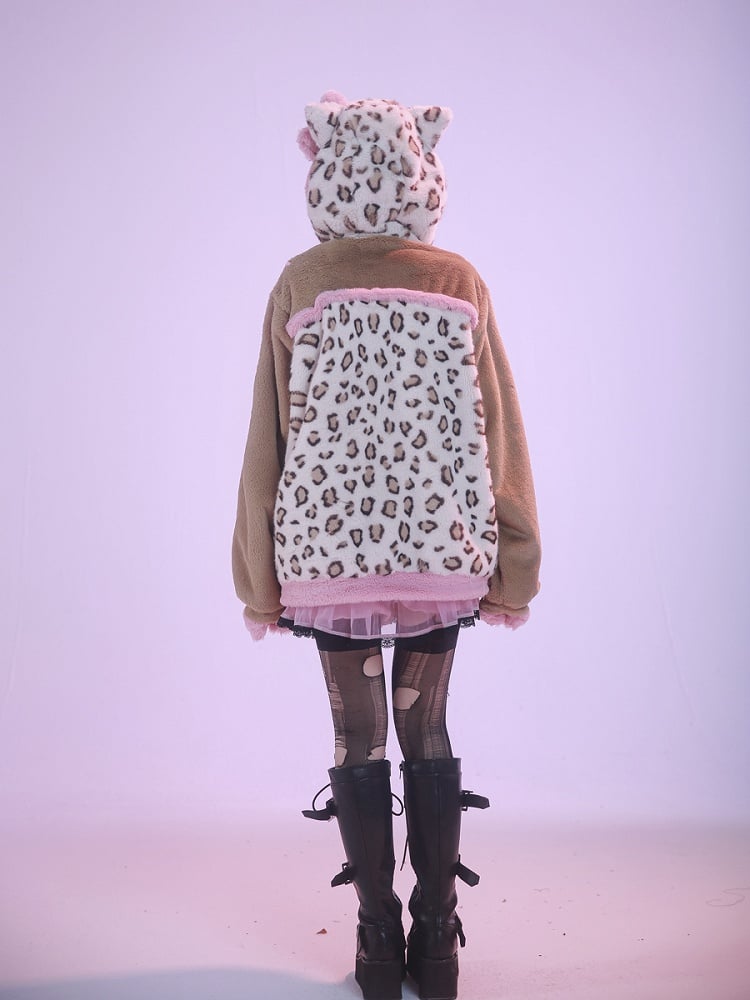 ブラウンとピンクのヒョウ柄猫耳フード付きプラッシュジャケット