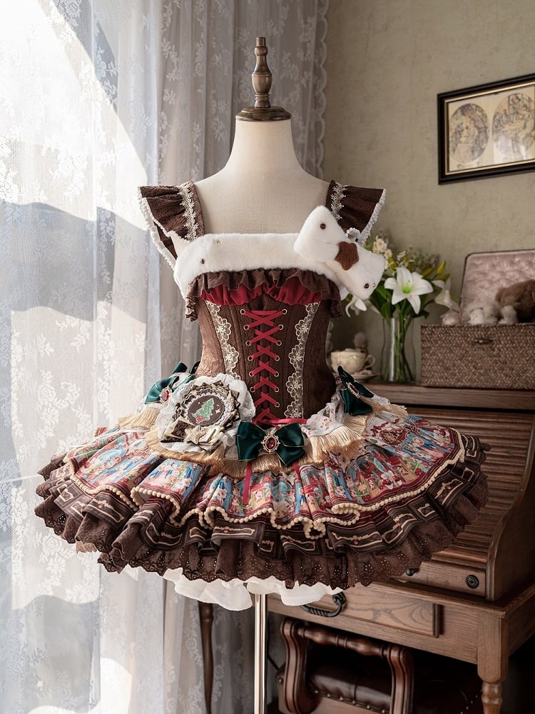 Brown Boned Corset Waist Layered Sweet Lolita Dress with Bow Decorations Christmas Vibes