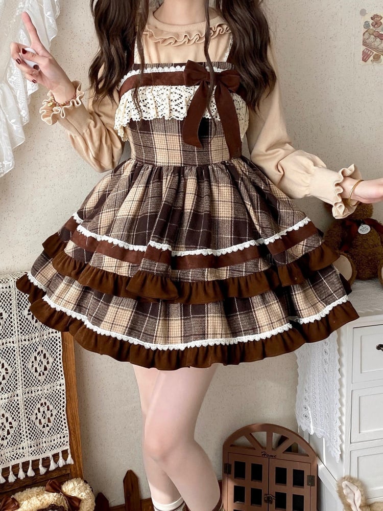この愛らしいブラウンのチェック柄ロリータワンピースは、秋冬にぴったりです。ハイウエストデザインはキュートなだけでなく、スタイルを美しく見せてくれます。クラシックなチェック柄は、ロリータファッションのワードローブに欠かせないアイテムです。この魅力的なジャンパースカートで、おしゃれで快適な着心地をキープしましょう。