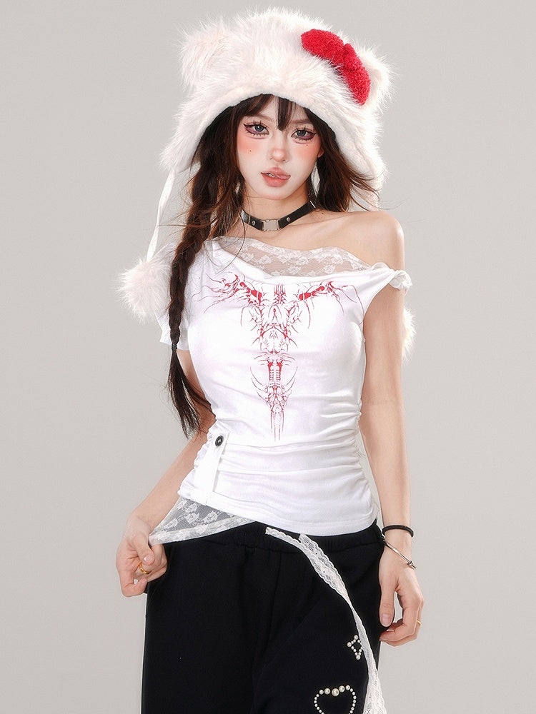 ブラウン/ホワイト アシンメトリーネックライン ルーシュプリント トップス