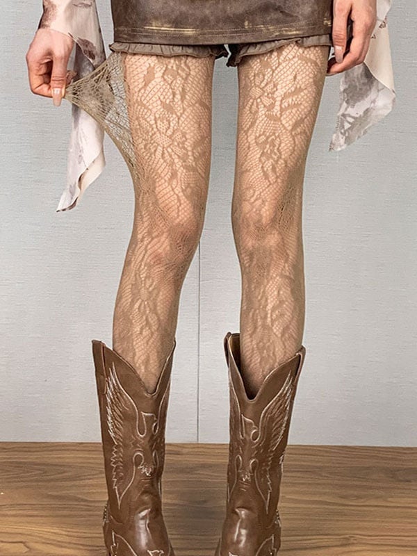 ブラウン Y2K フローラル ホロウアウト タイツ