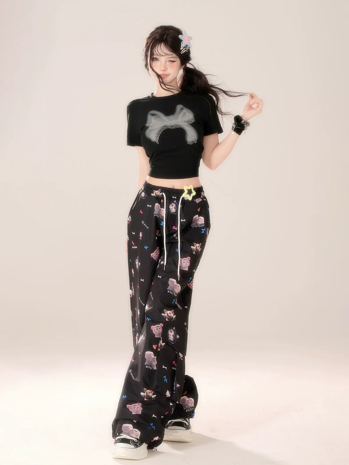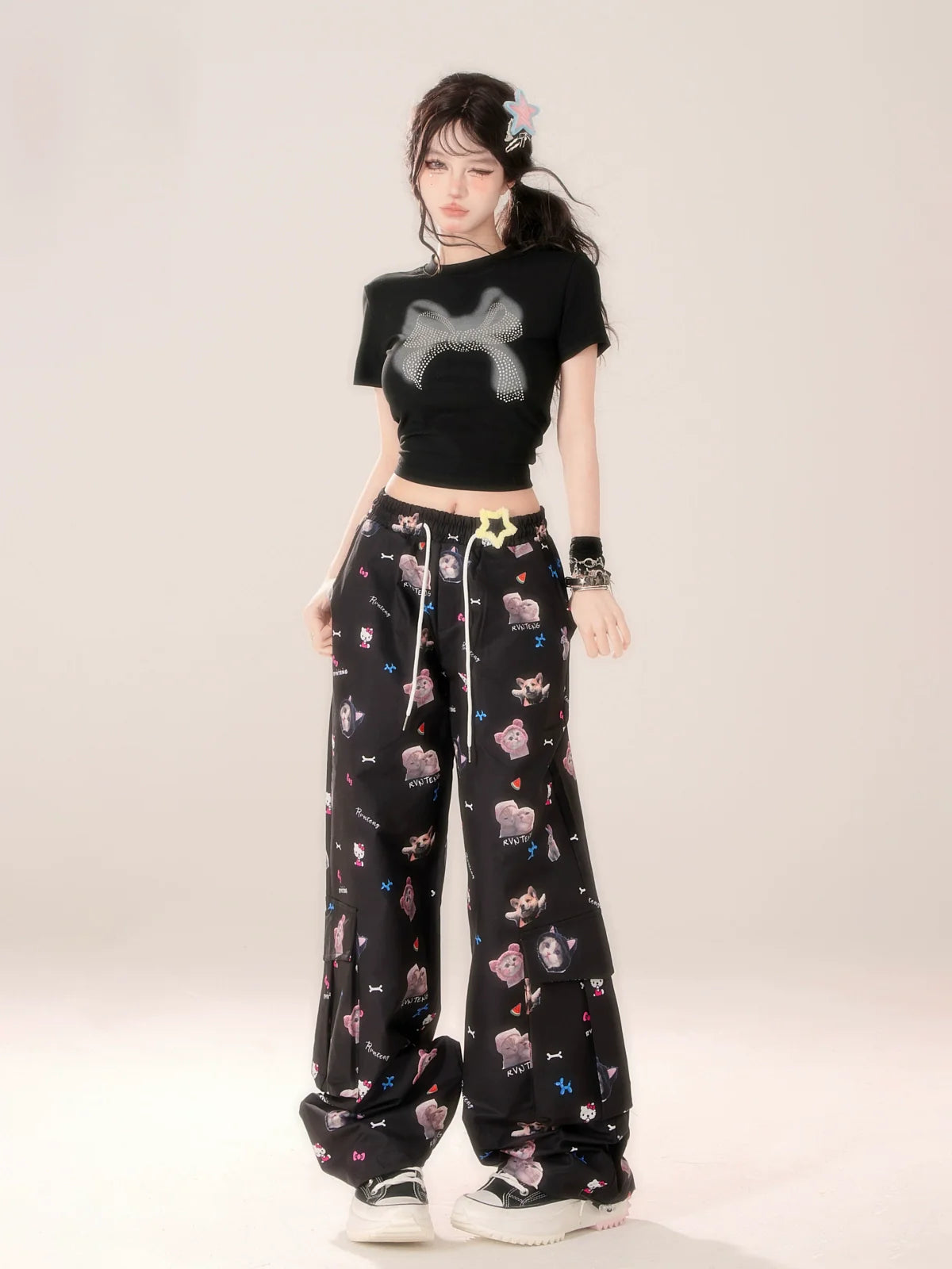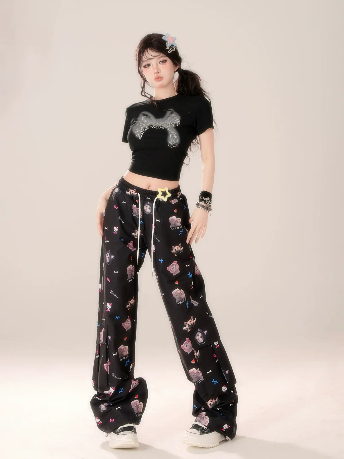 洗練されたブラックのカジュアルニッチパンツは、遊び心のあるフックキャットデザインがユニークなひねりを効かせています。どんなコーディネートにもキュートなアクセントを添えてくれます。