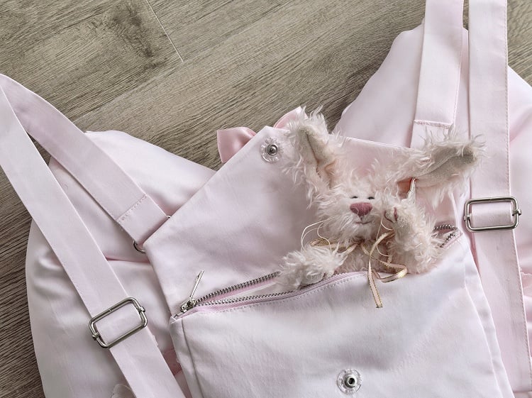 雪の結晶とビーズチェーンで飾られた青い大きなリボンのバックパック