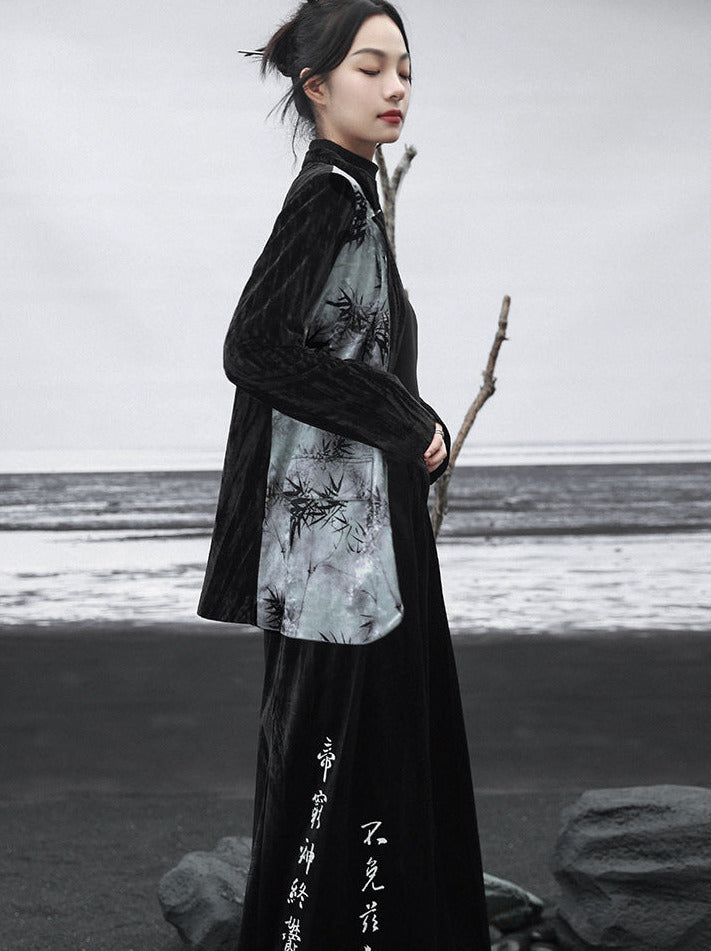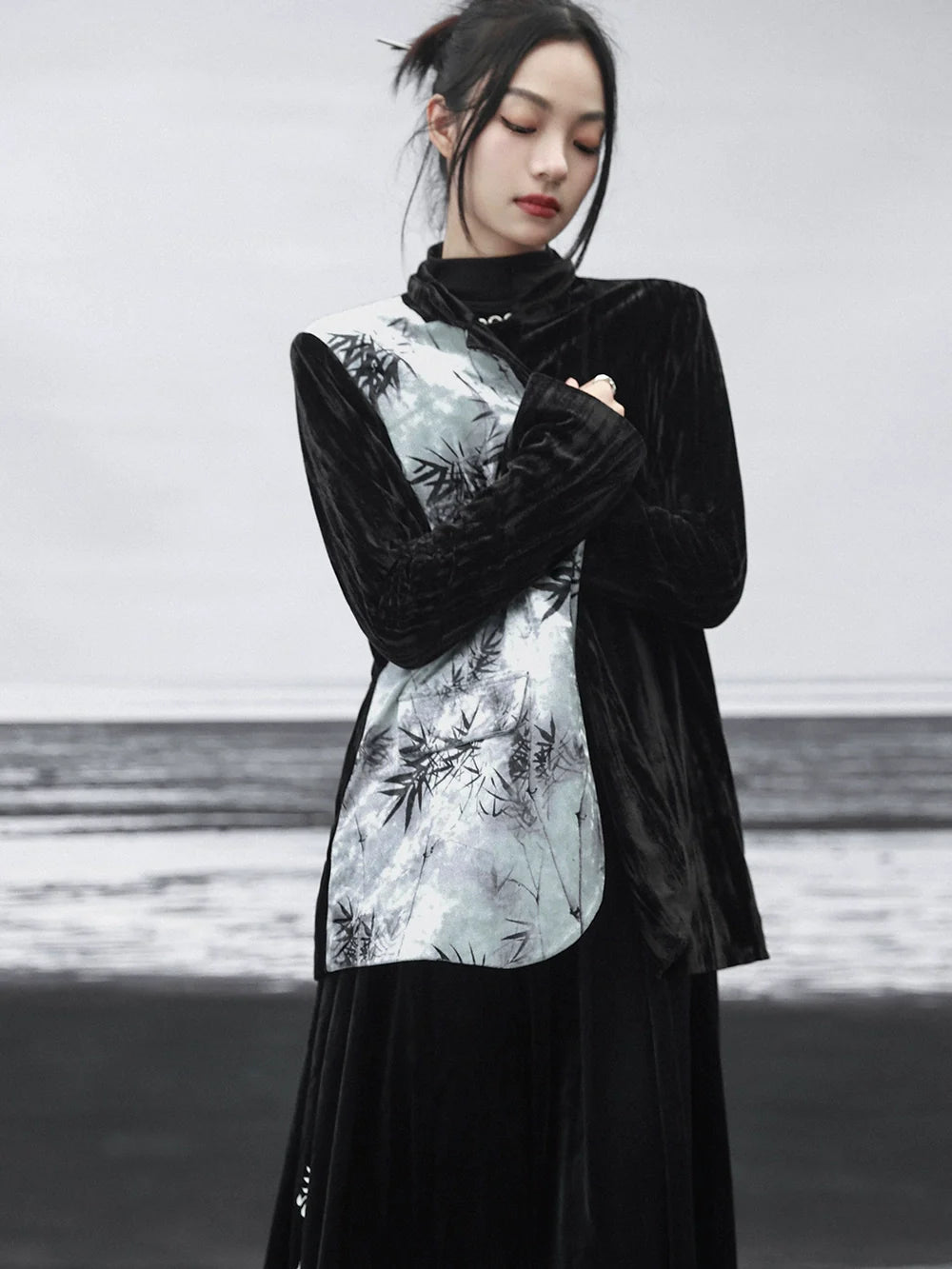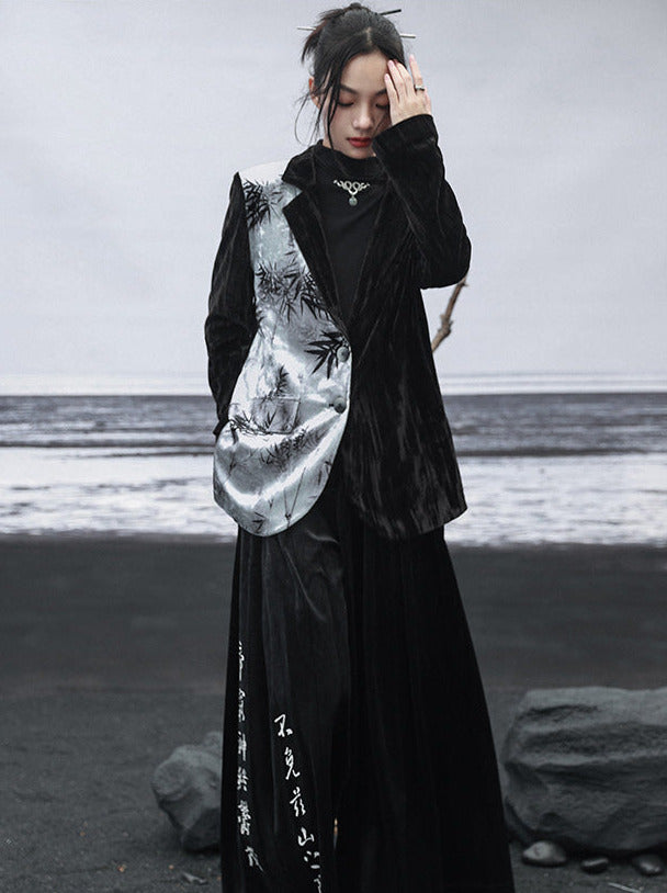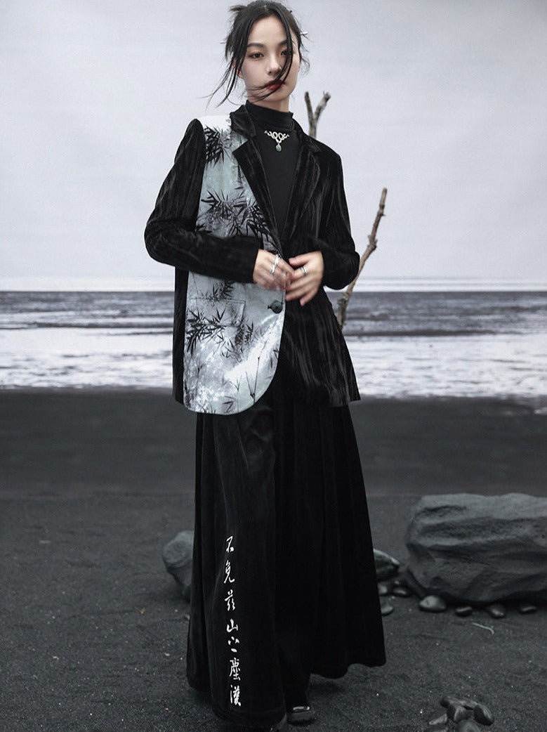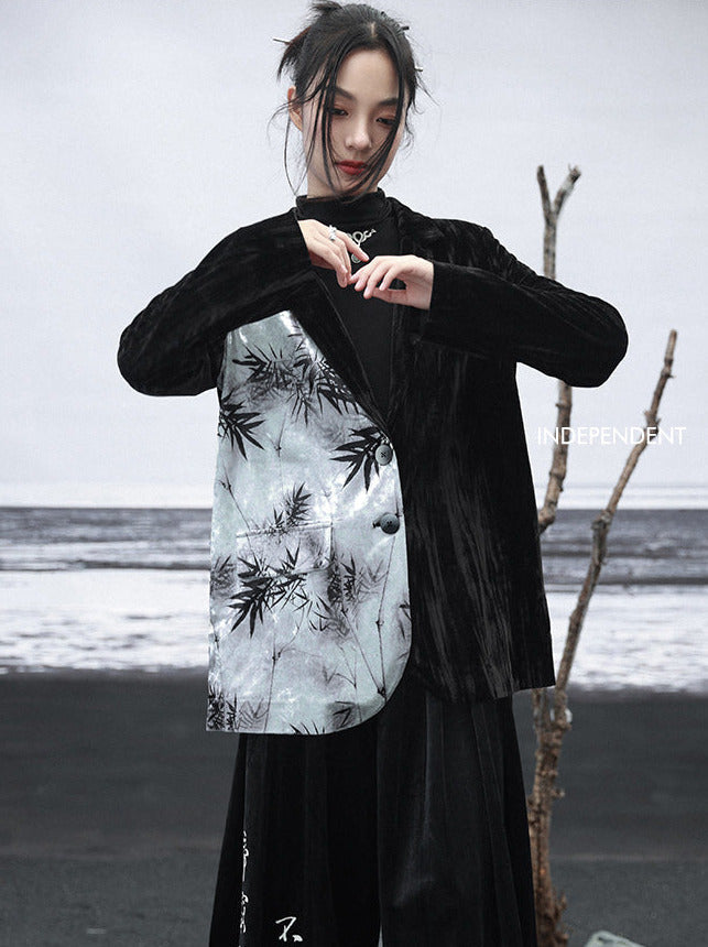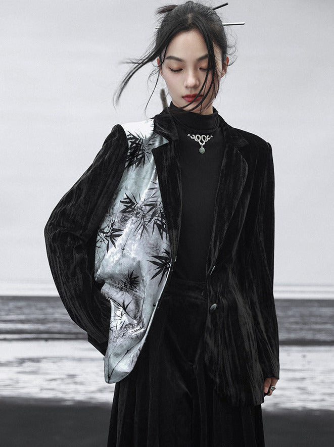 中国プリントジャケット コントラスト竹ベルベットカラースプライシング