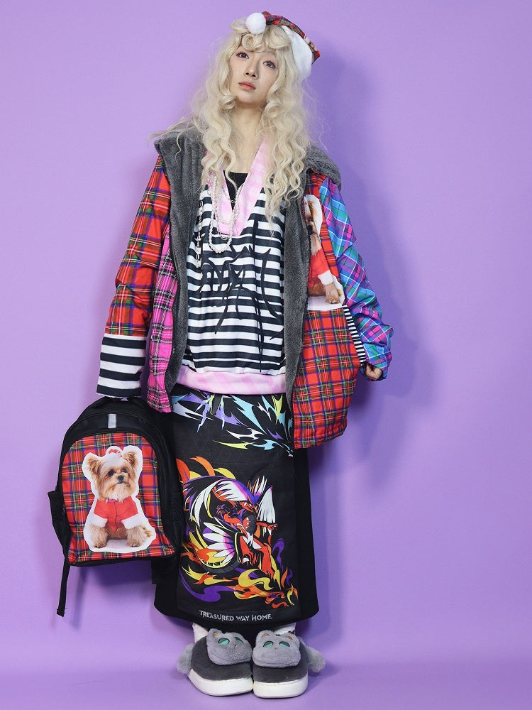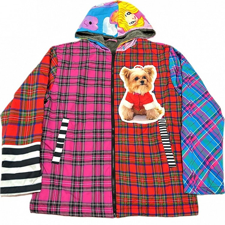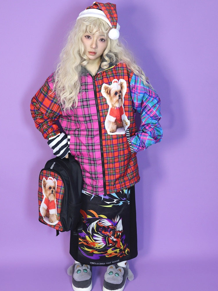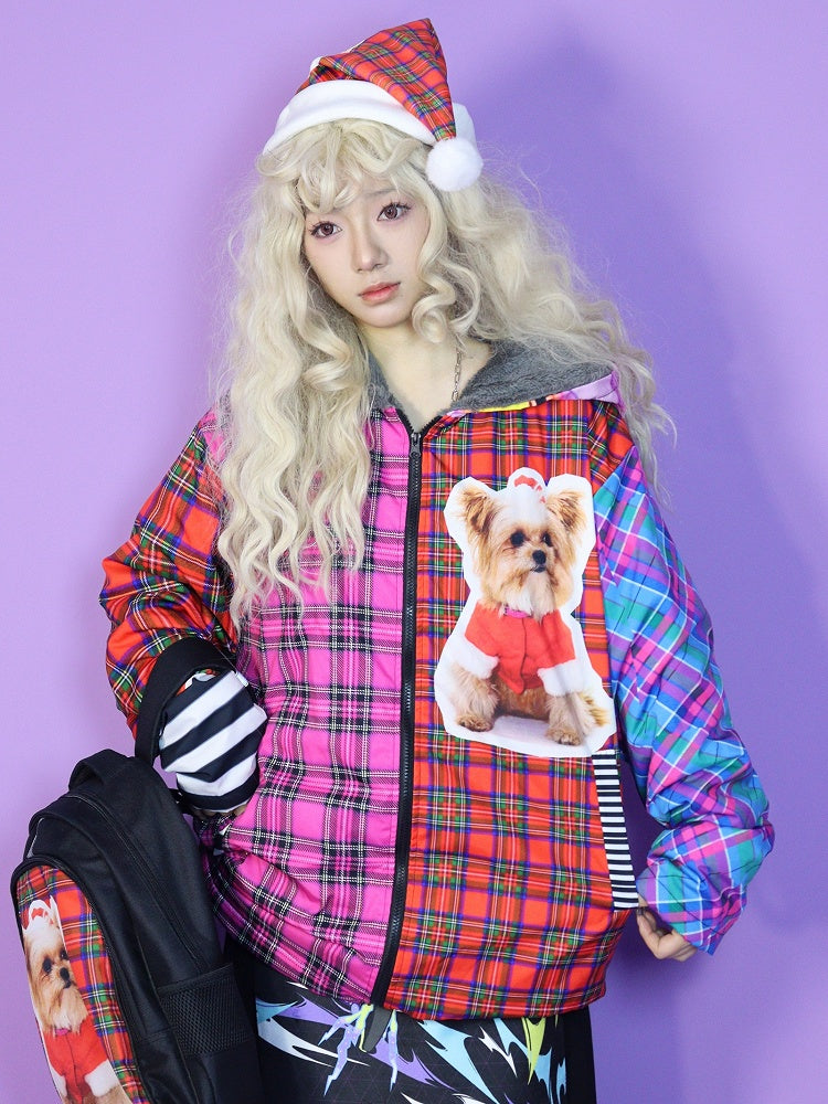 クリスマス Y2K カラフルオーバーサイズ フード付きフリース裏地ジャケット チェック柄と子犬プリント