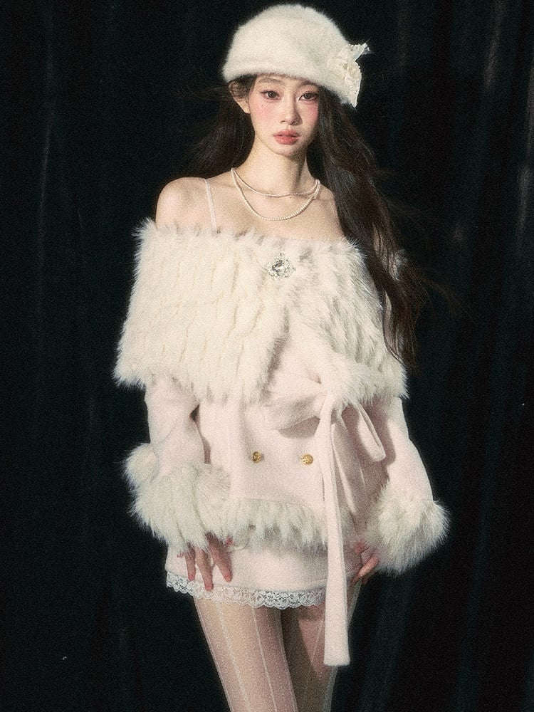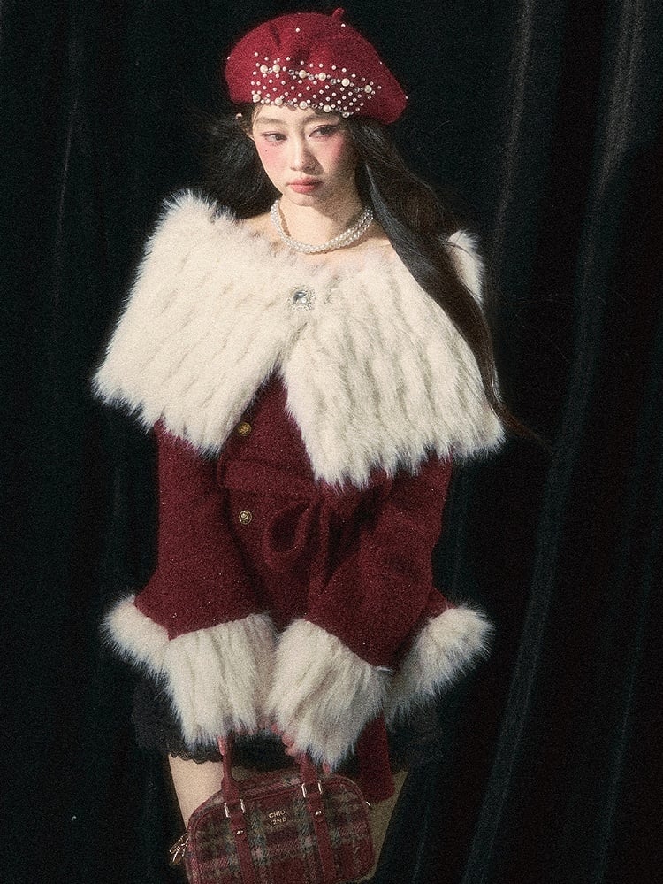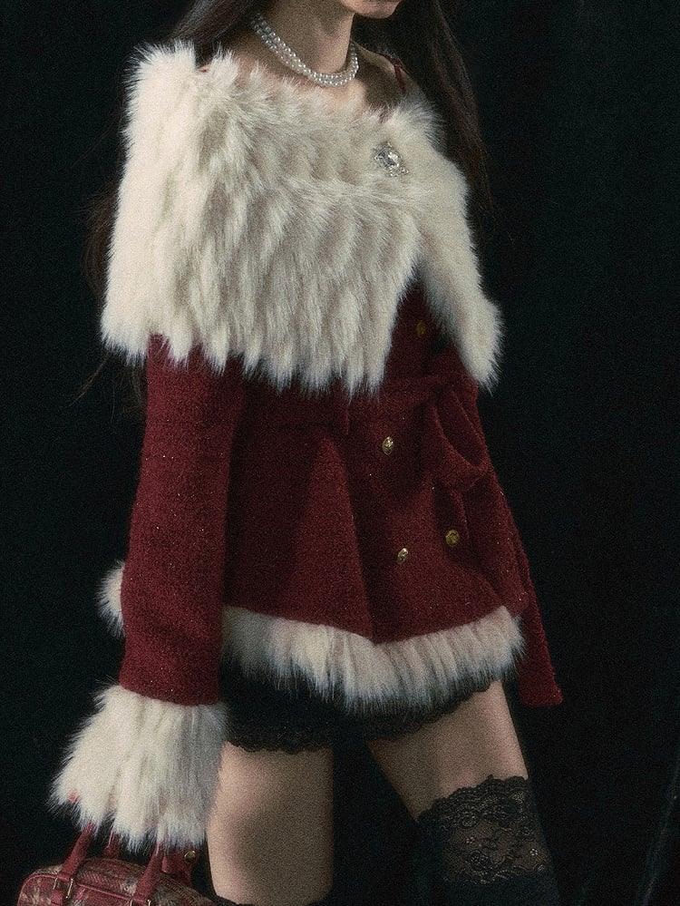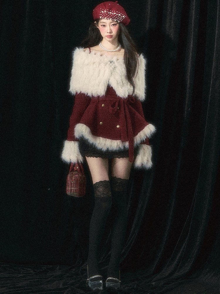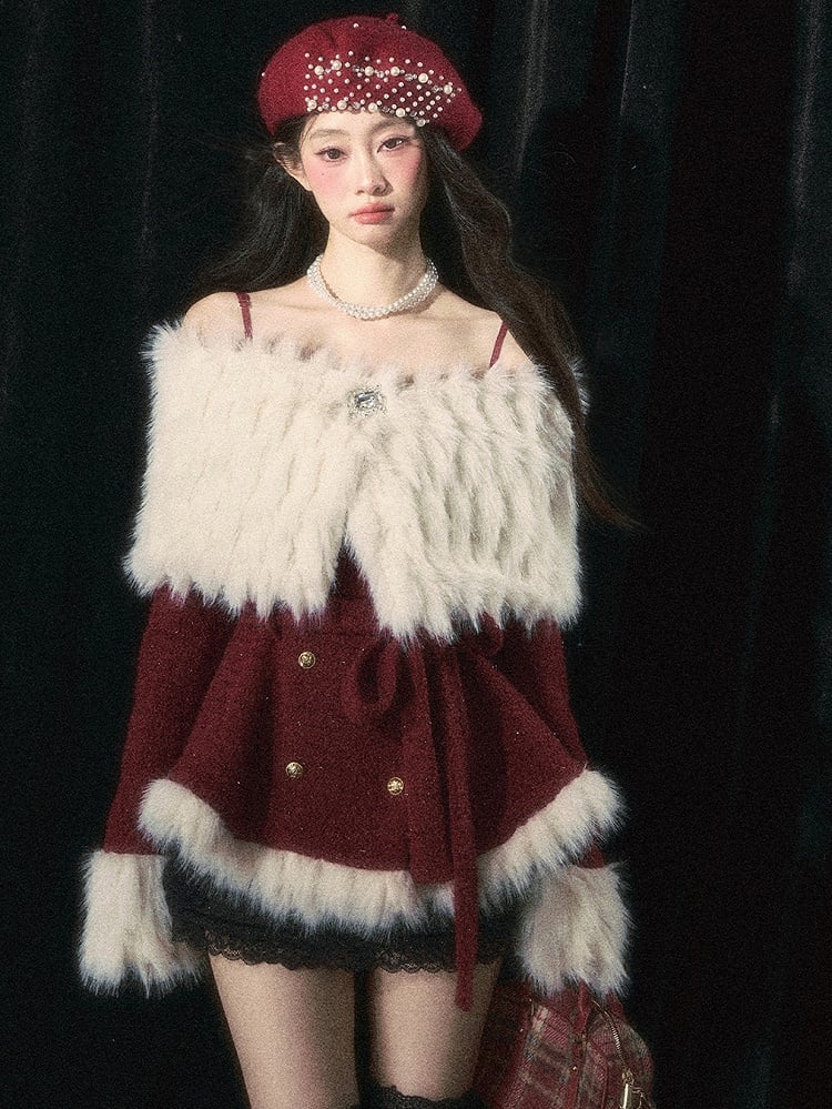 クリスマスレッド/ホワイトのエレガントなオフショルダーネックラインコート、取り外し可能なプラッシュショール