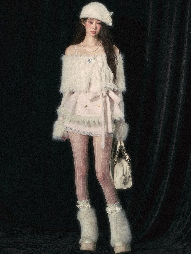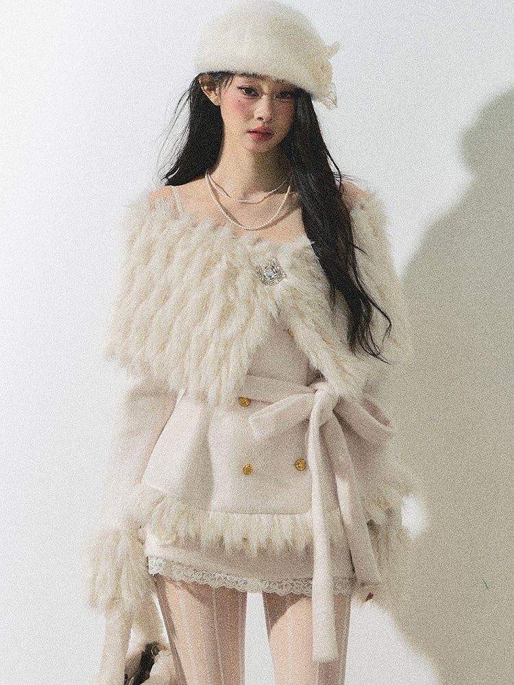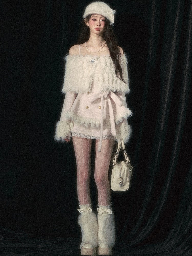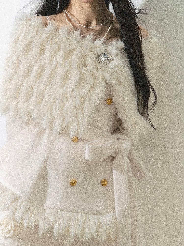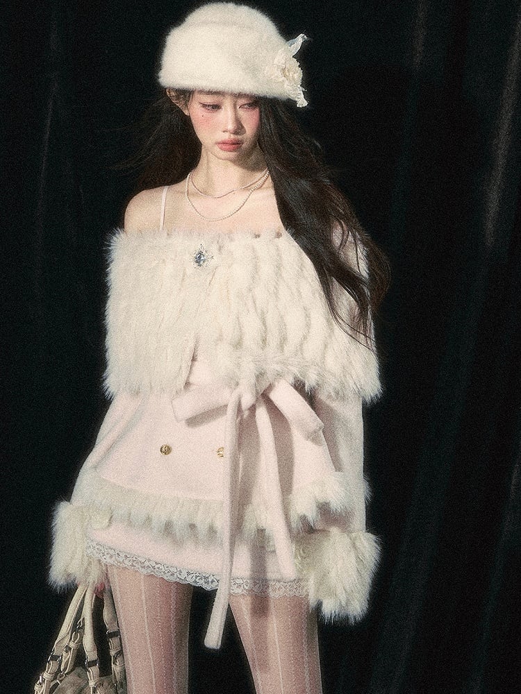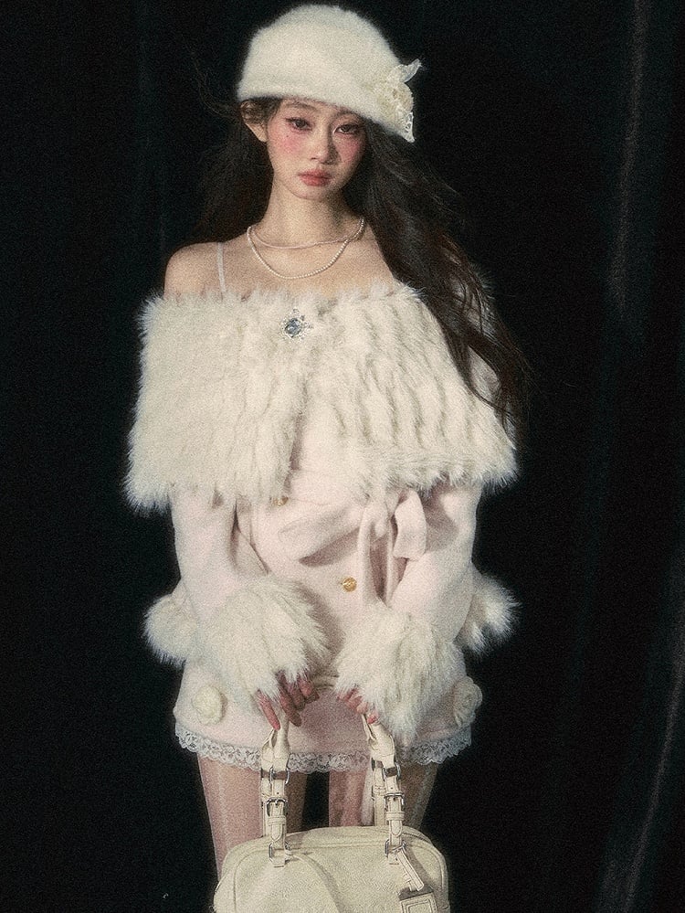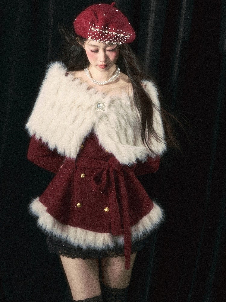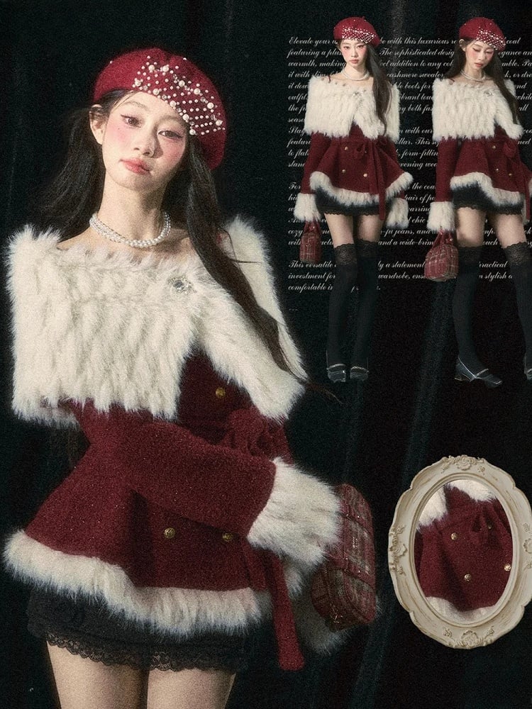 クリスマスレッド/ホワイトのエレガントなコートは、スタイリッシュさと暖かさが完璧に融合しています。オフショルダーのネックラインがエレガントな雰囲気を添え、取り外し可能なプラッシュショールが快適さと着回し力を高めます。このホリデーシーズンは、心地よくシックに過ごしましょう。