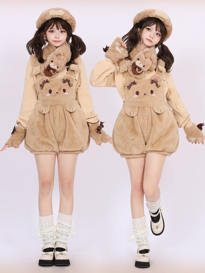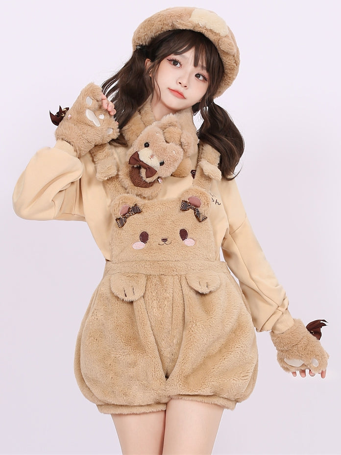 コーヒーキュートなテディベア柄のオーバーオールショーツで、ワードローブにキュートさをプラス!チャーミングなリボンディテールが特徴のこのショーツは、とても柔らかいプラッシュ素材で仕立てられており、スタイリッシュさと快適さを兼ね備えています。カジュアルなシーンにも、お家でのくつろぎタイムにもぴったりです。