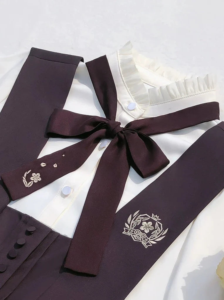 襟付きコサージュドレス レトロシャツベストカーディガン スタンドニット フリルスリーブ + 日本製リボン