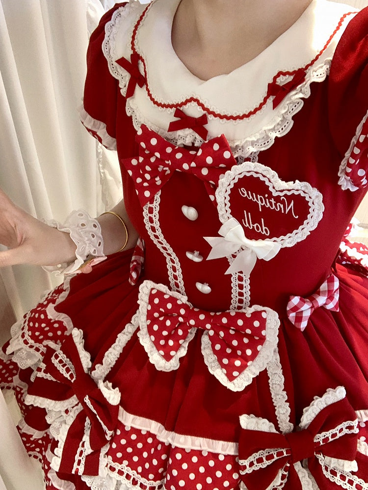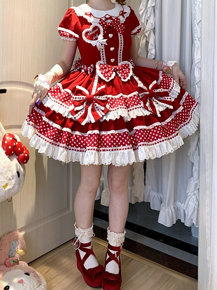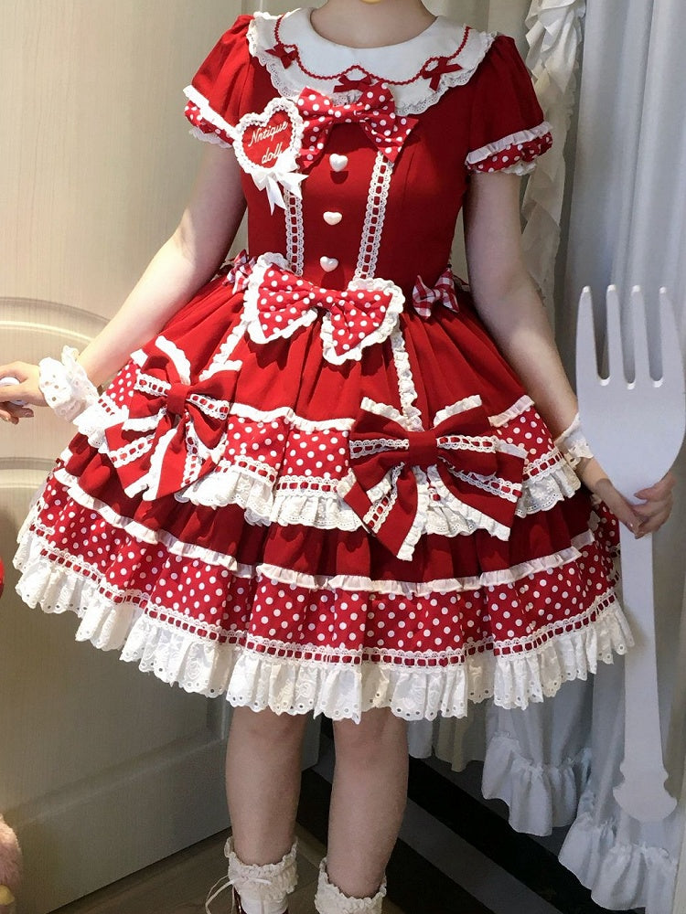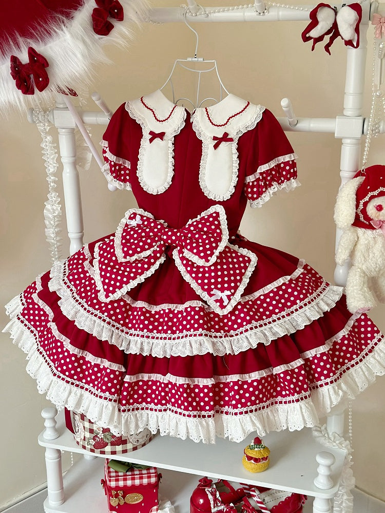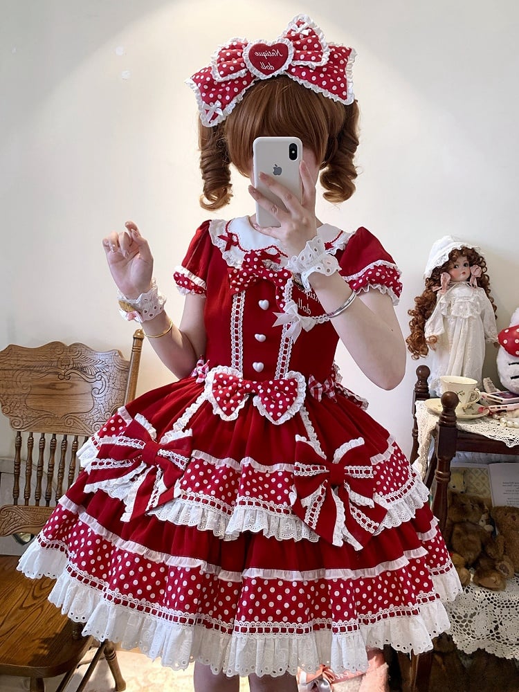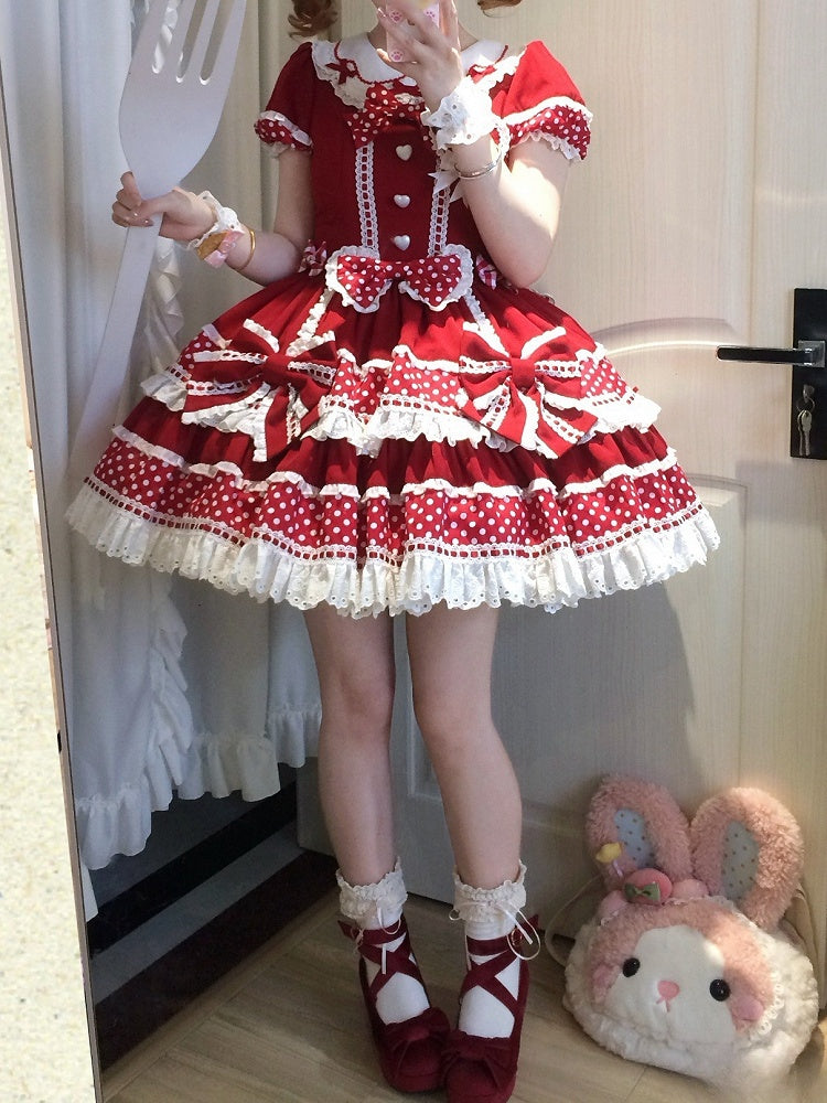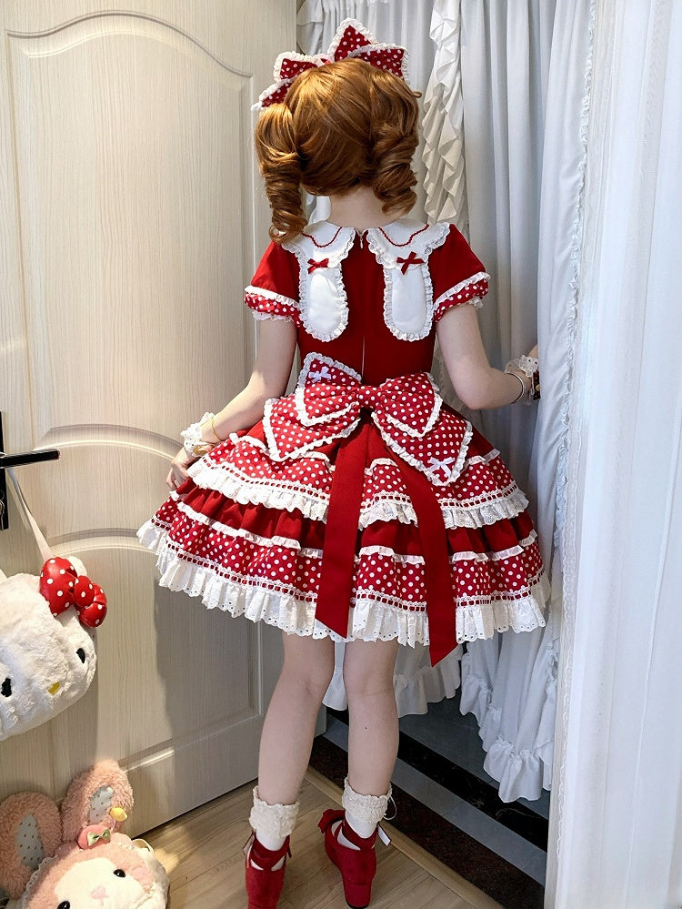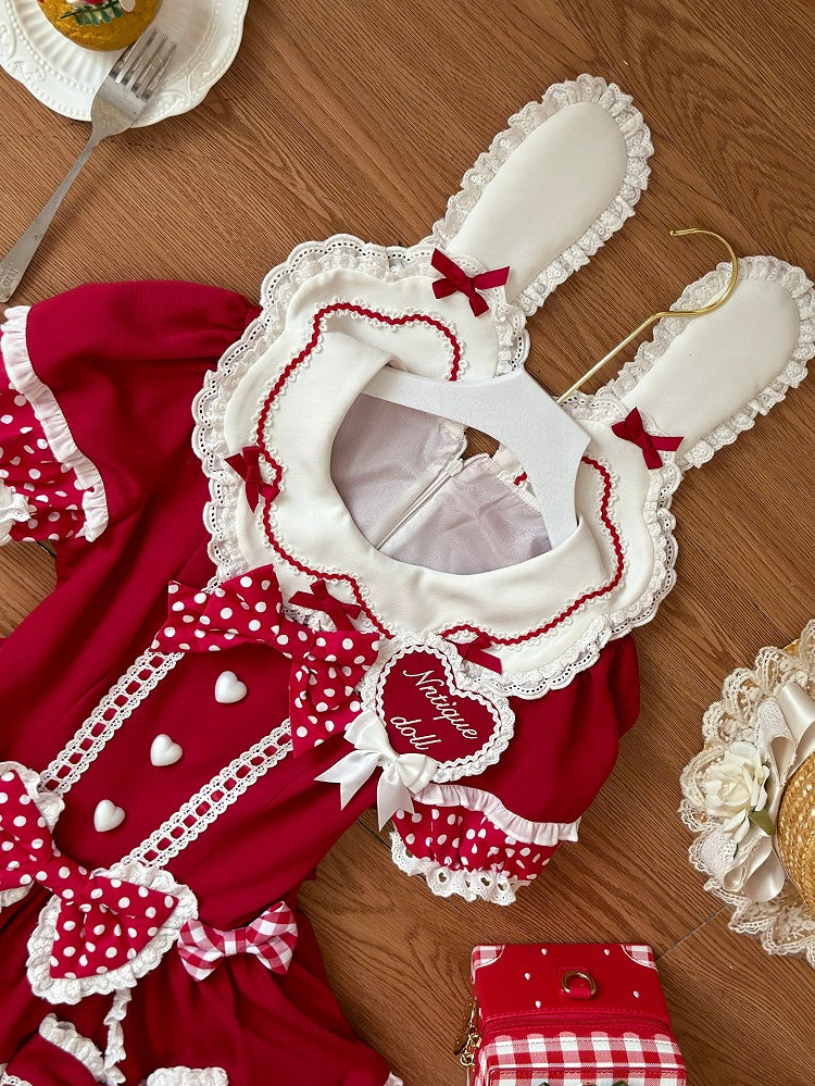 赤い耳の襟、甘いロリータドレス、ドット柄のバニー、水玉模様のアクセント、リボンバック