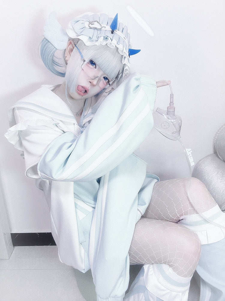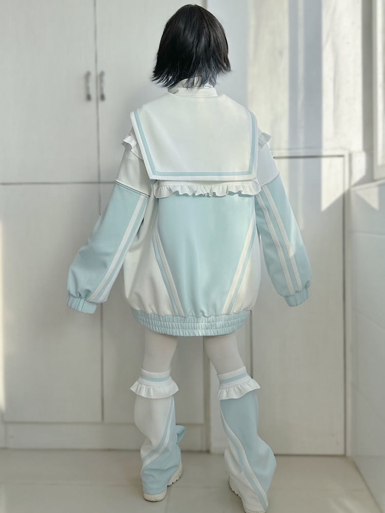 ホワイト&グリーン ジライケイ セーラーカラー ジップ開閉 スウェットシャツ ジャケット アシンメトリー レッグウォーマー付き