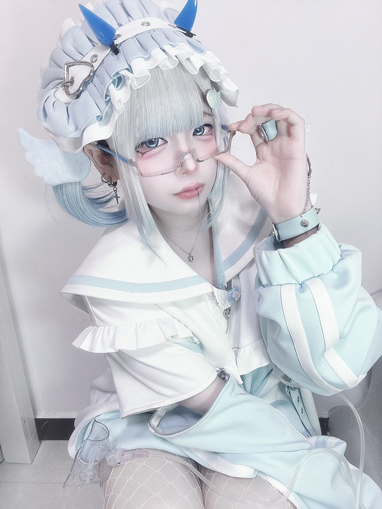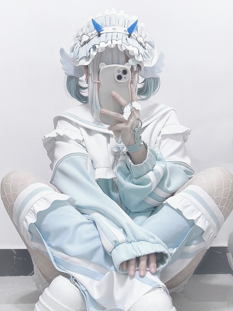 青と白のオールドスクールロリータファッションドレス 蝶結びディテール JSK セット