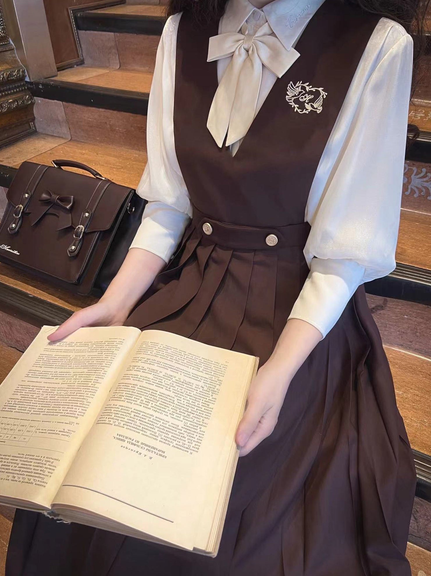 カレッジベストスカート シフォン + シャツスタイル クリームアクセサリー インナーリボン Vネック