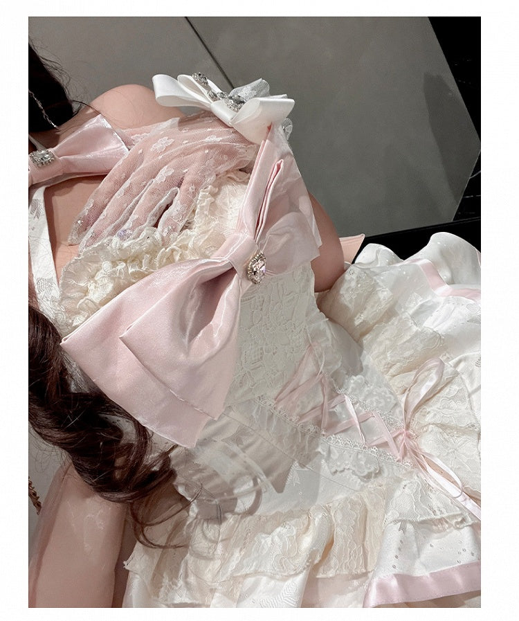 ピンクと白のオールドスクールロリータファッションドレス、蝶結びディテール、ロリータJSKセット