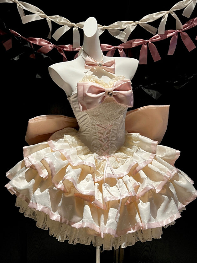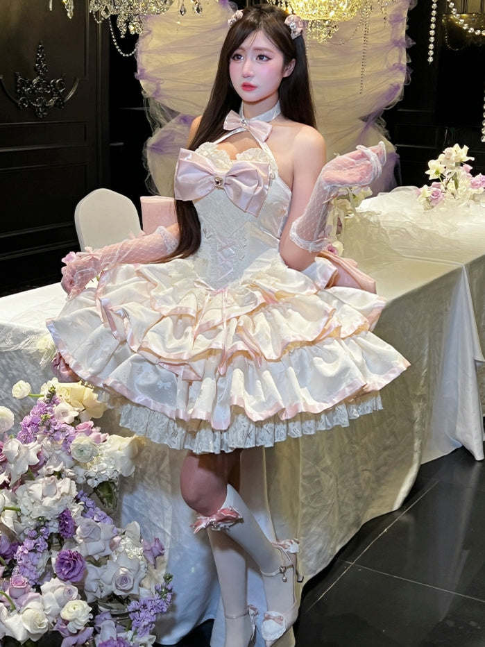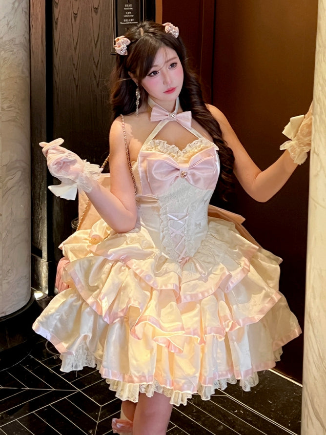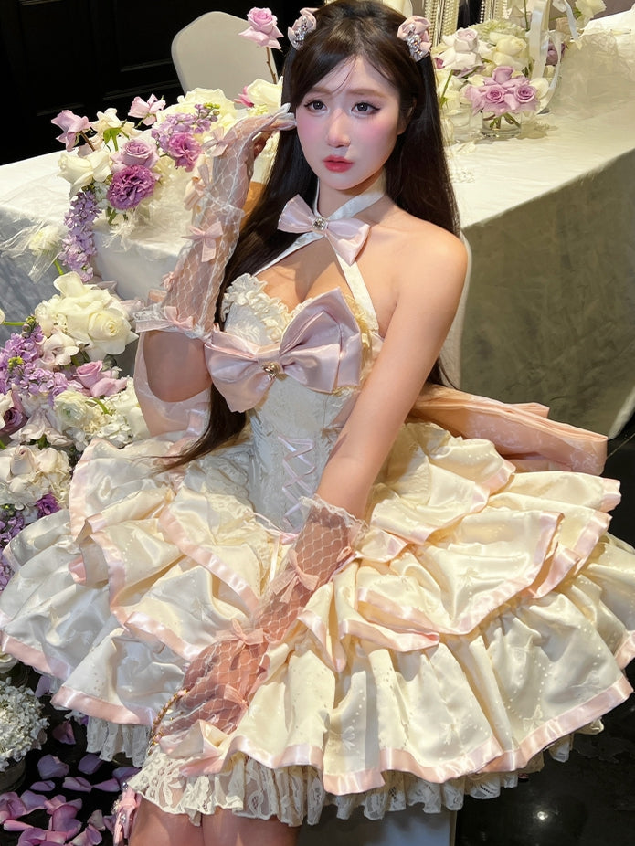 クリーミーな蝶結び生地のティアードパフィースカート、ホルターネック、バースデーコルセットドレス
