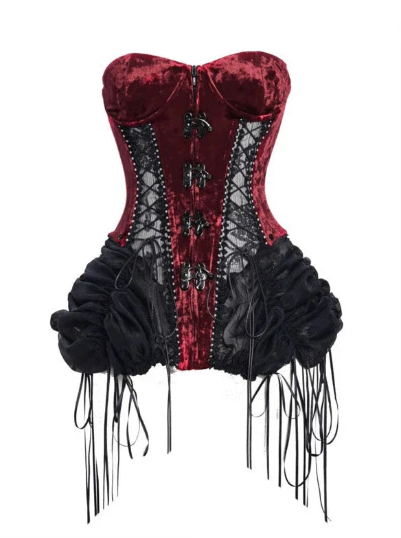 ゴシック風のコルセットセットは、フィッシュボーンストラップとチュールのアクセントが美しいダークアリスデザインが特徴です。キュートでエッジの効いたこのアンサンブルで、スタイルをワンランクアップさせましょう。