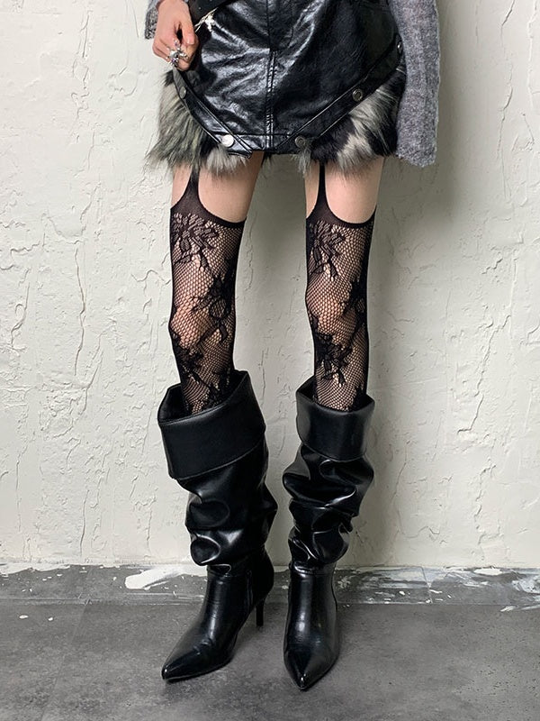 ダークゴシックブラックパンクフローラルホローアウトサスペンダータイツ