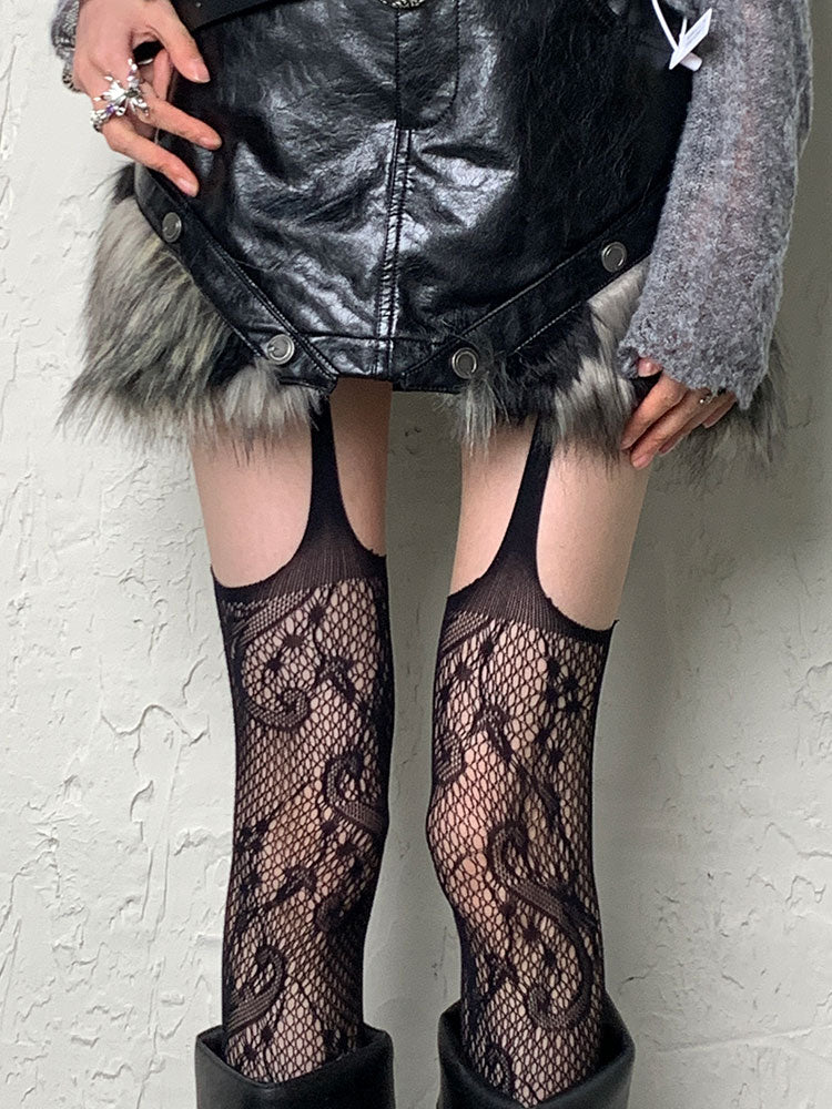 ダークゴシックブラックパンクホローアウトサスペンダータイツ