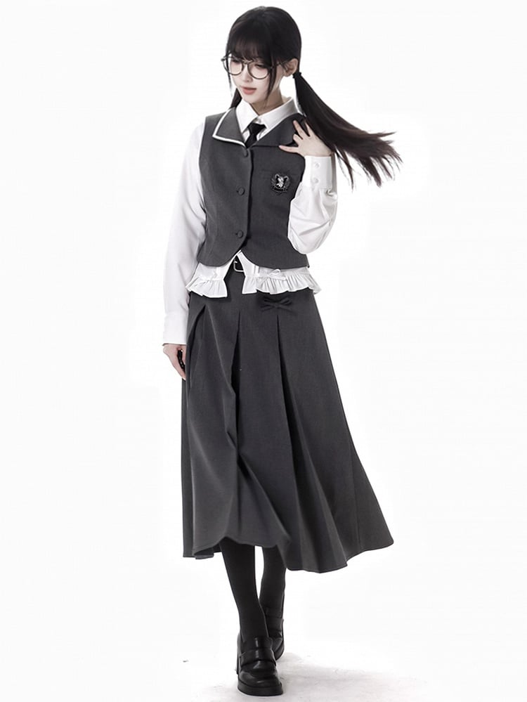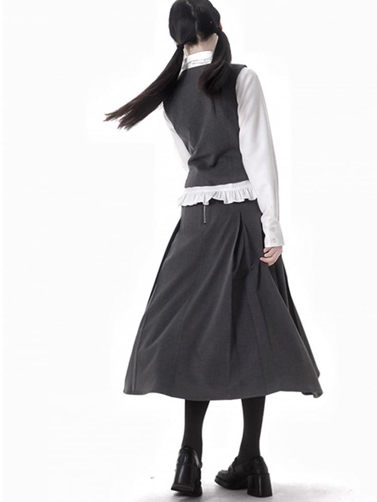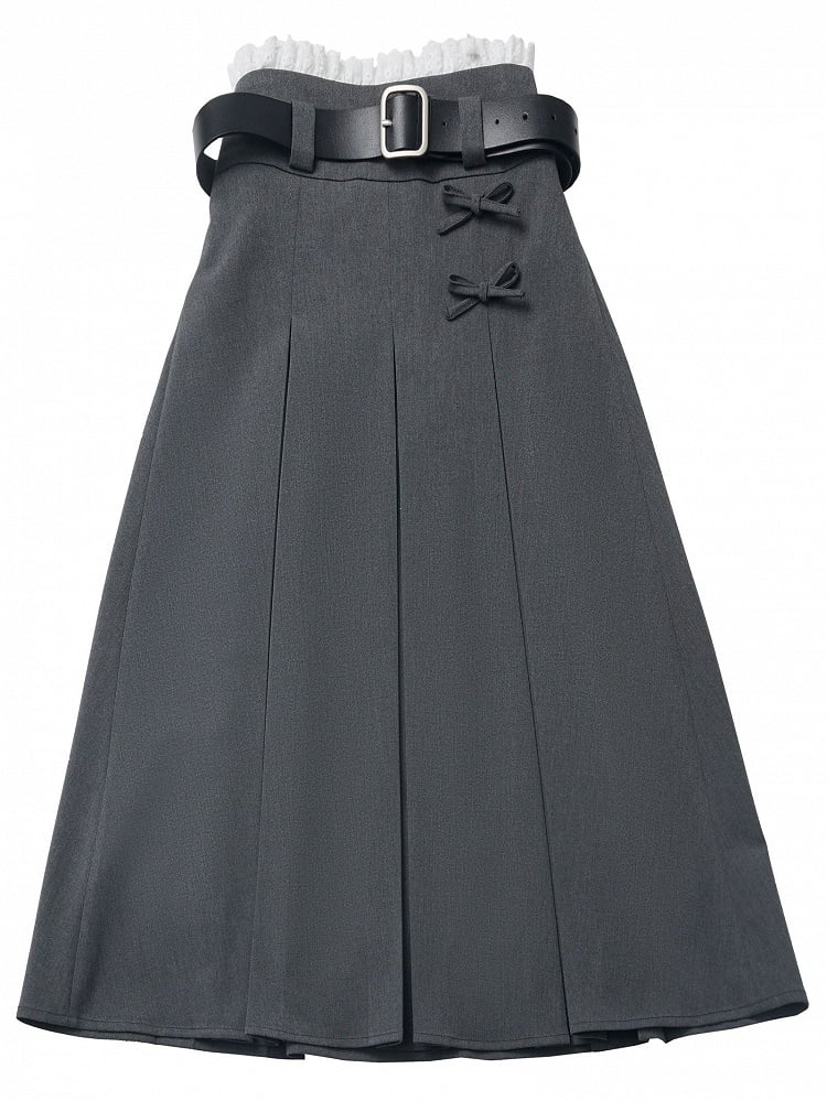 ダークグレーのリボン結びレーストリムボックスプリーツロングスカート(バックルベルト付き)