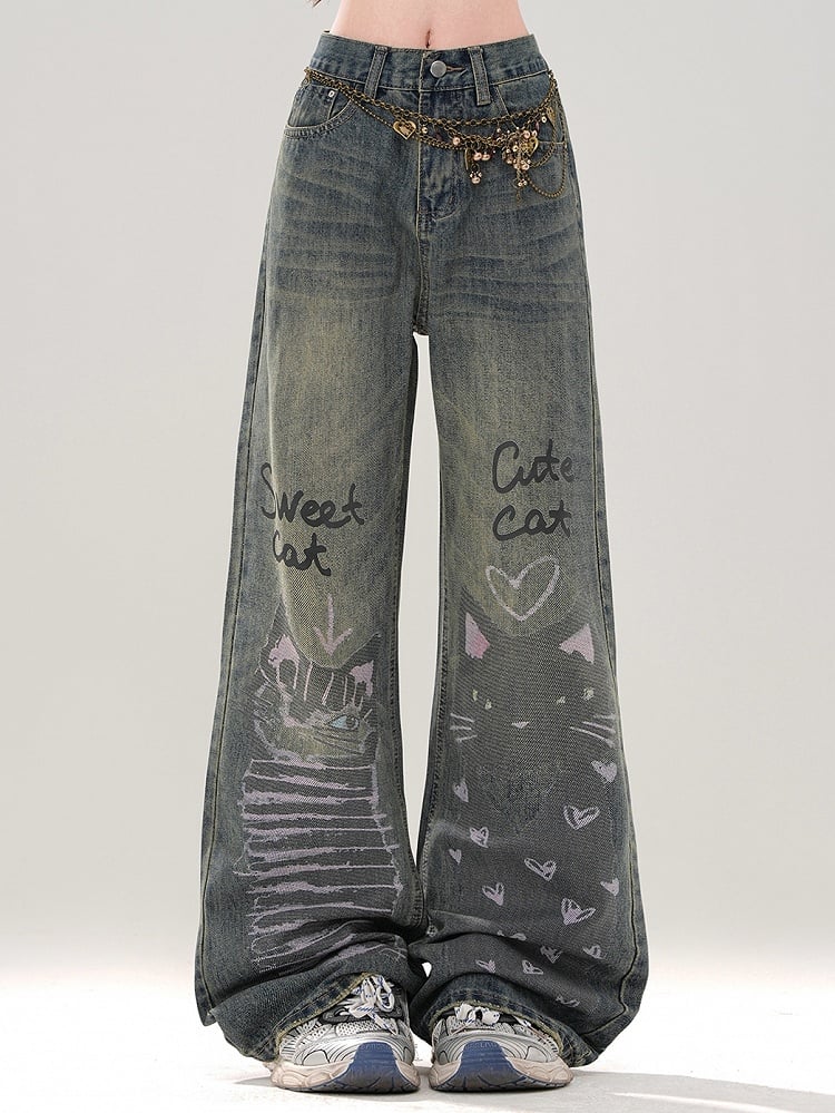 デニムブルーのキュートなキティのフェードウォッシュワイドレッグカットジーンズ