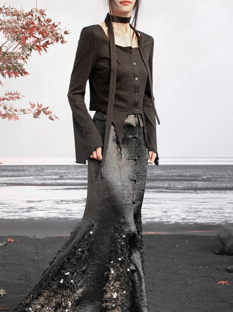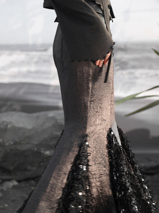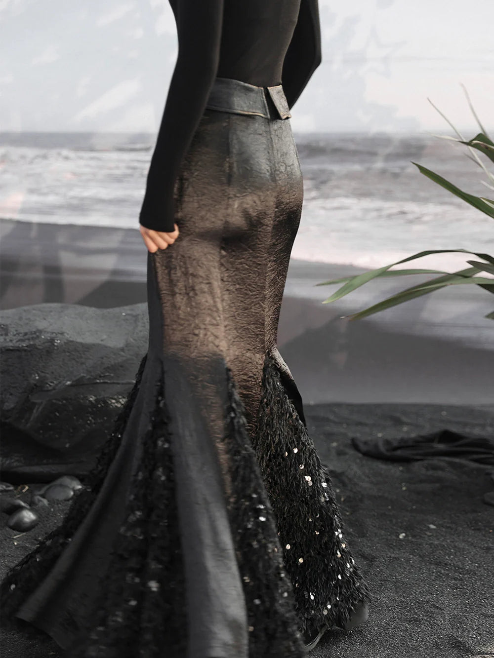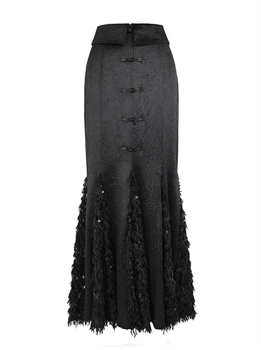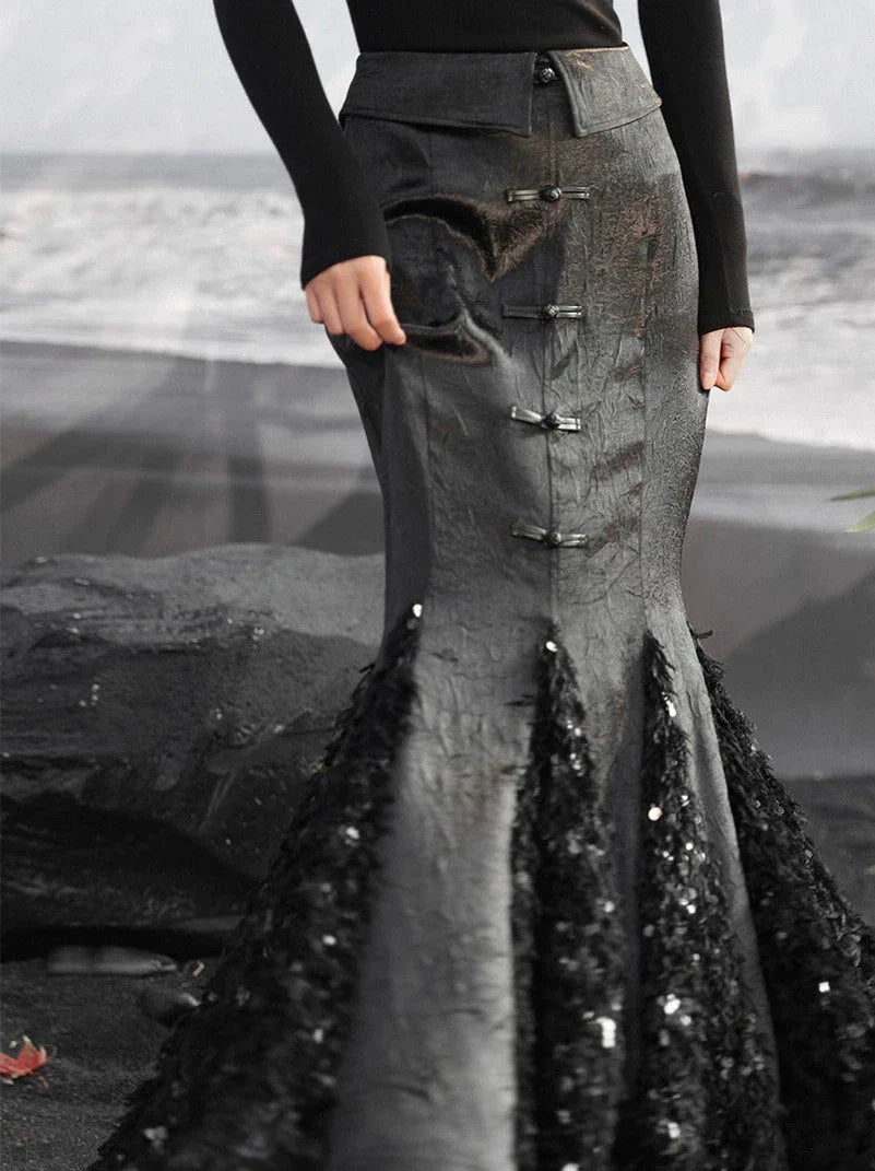デザインスカート マーメイド チャイナ サテン スプライス フェザー スパンコール ダーク