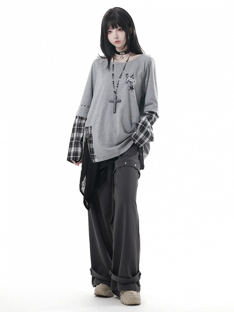 Grey Taste Aesthetic: Unisex Oversized Top with Detachable Plaid Sleeves & Studded Zipper Slit