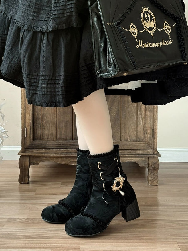 Black Mid-heel Boots with Crisscross Details - Detachable Lily of the Valley Bow & Ruffle Trim