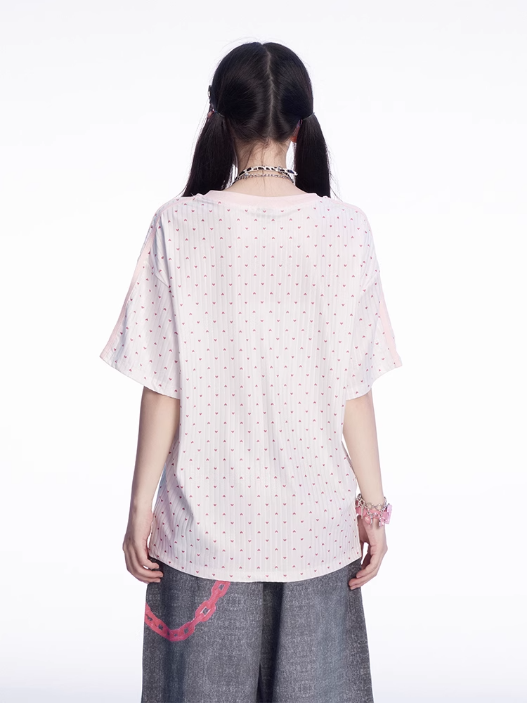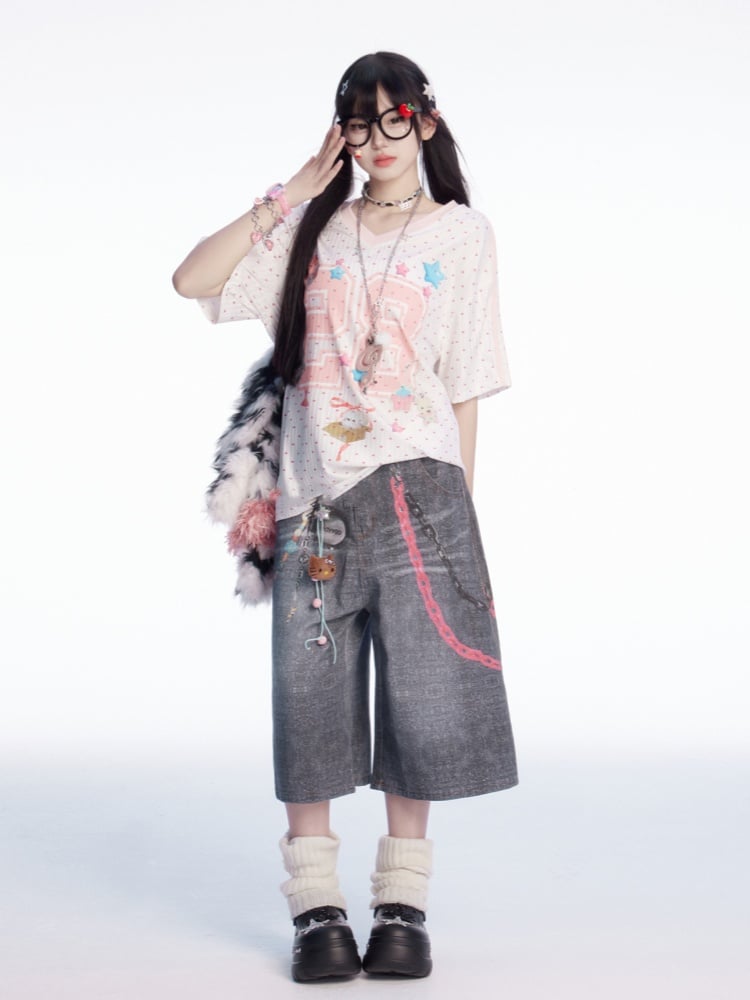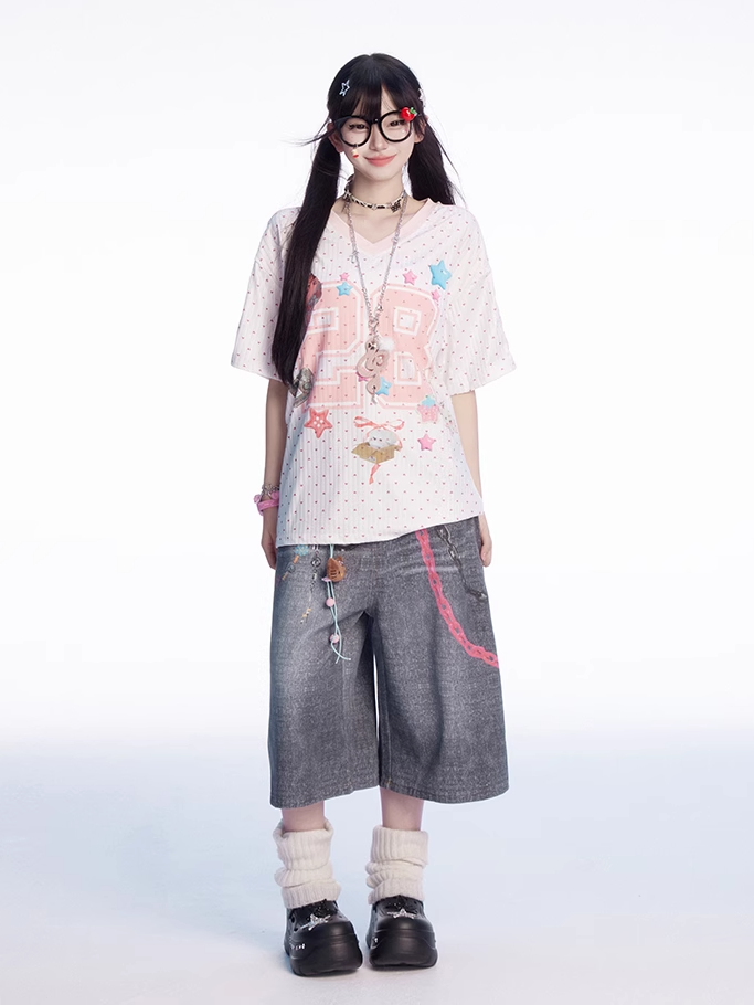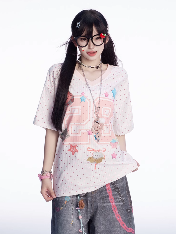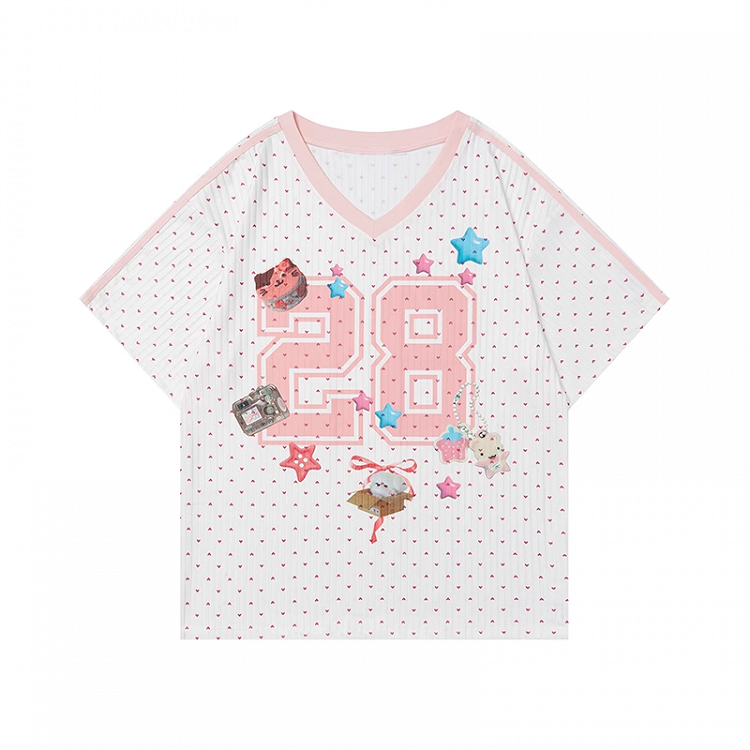 ホワイトVネックナンバー&スタープリント水玉Tシャツ
