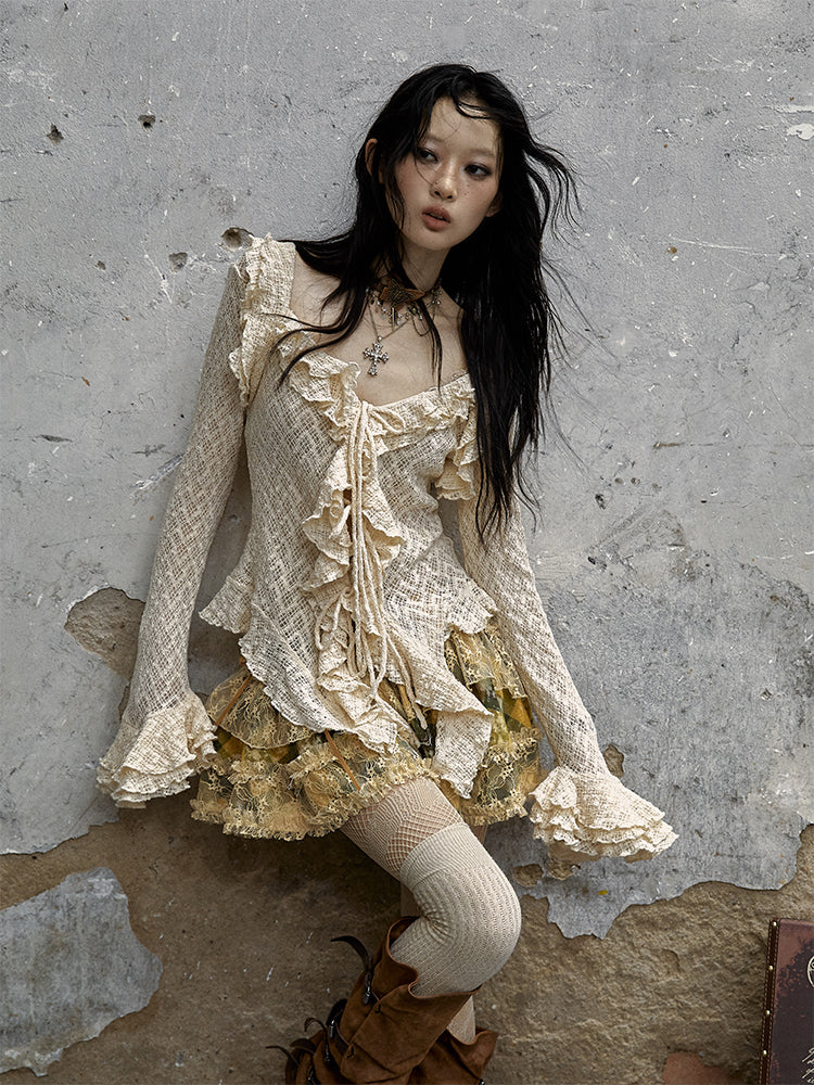 Drawstring Bell Detail Vintage with Ruffle Apricot Sleeves Blouse