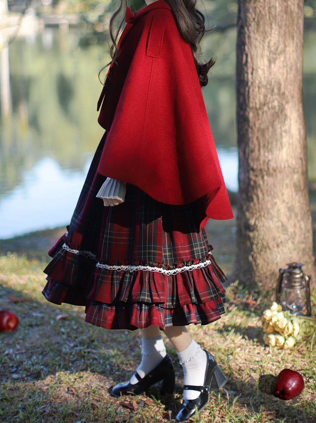 ドレス リボンカラー フード ヘッドライディング レッド リトル + スカーフ ティアード プリーツ ケープ コート チェックシャツ