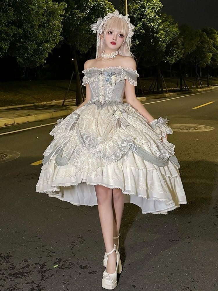 ダスティブルーのコルセットウエスト花嫁プリンセスロリータハイローレイヤードヘムドレスショートバージョン
