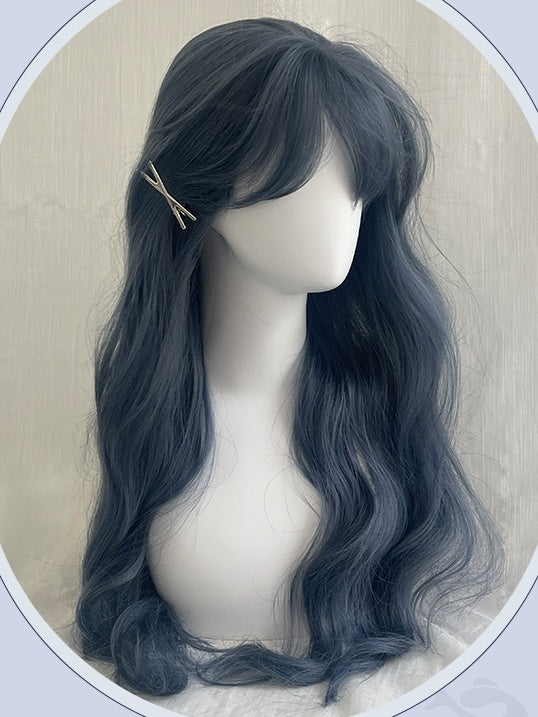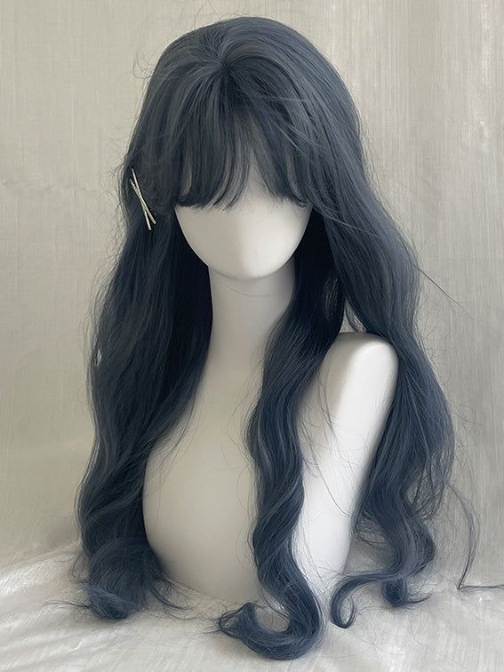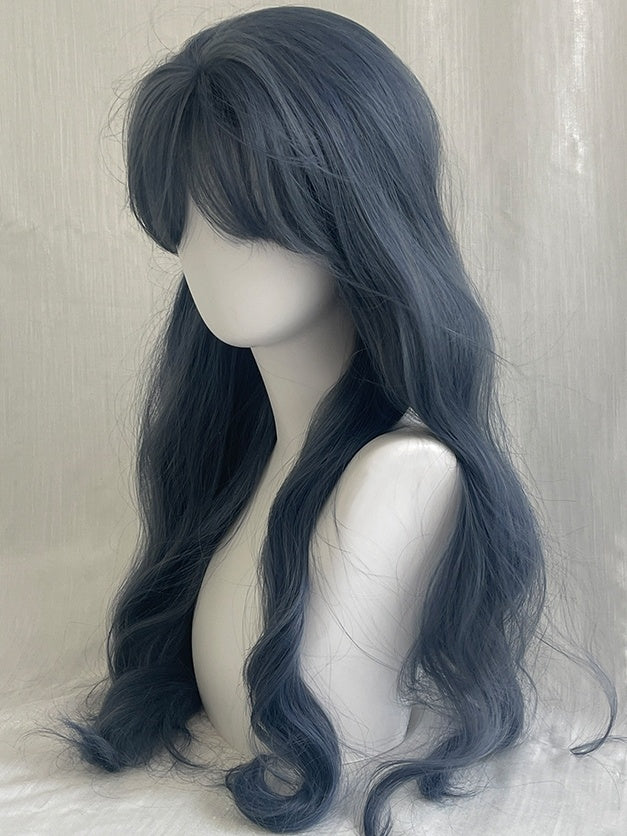 ダスティブルーのウエスト丈ウェーブウィッグ(エアバング付き)