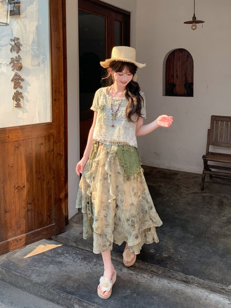 モリケイ グリーン タイダイ ワイドレッグパンツ 取り外し可能なニットアクセサリー付き レギュラー/ショートバージョン