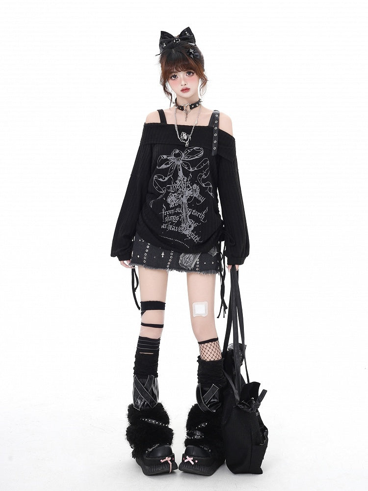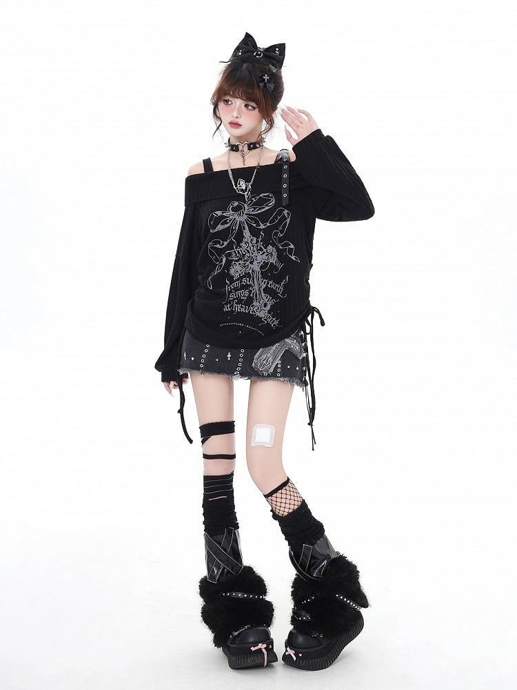 Edgy Bittersweet Black Print Waist Off-Shoulder Top: Drawstring Gray