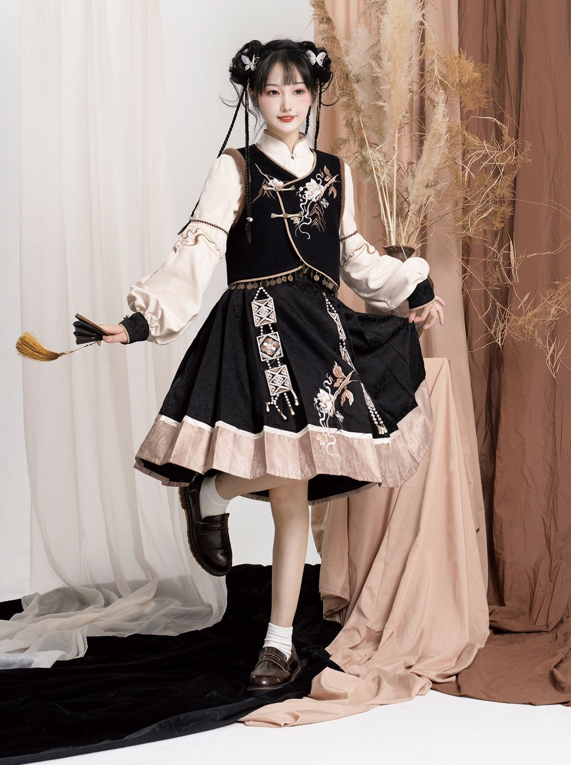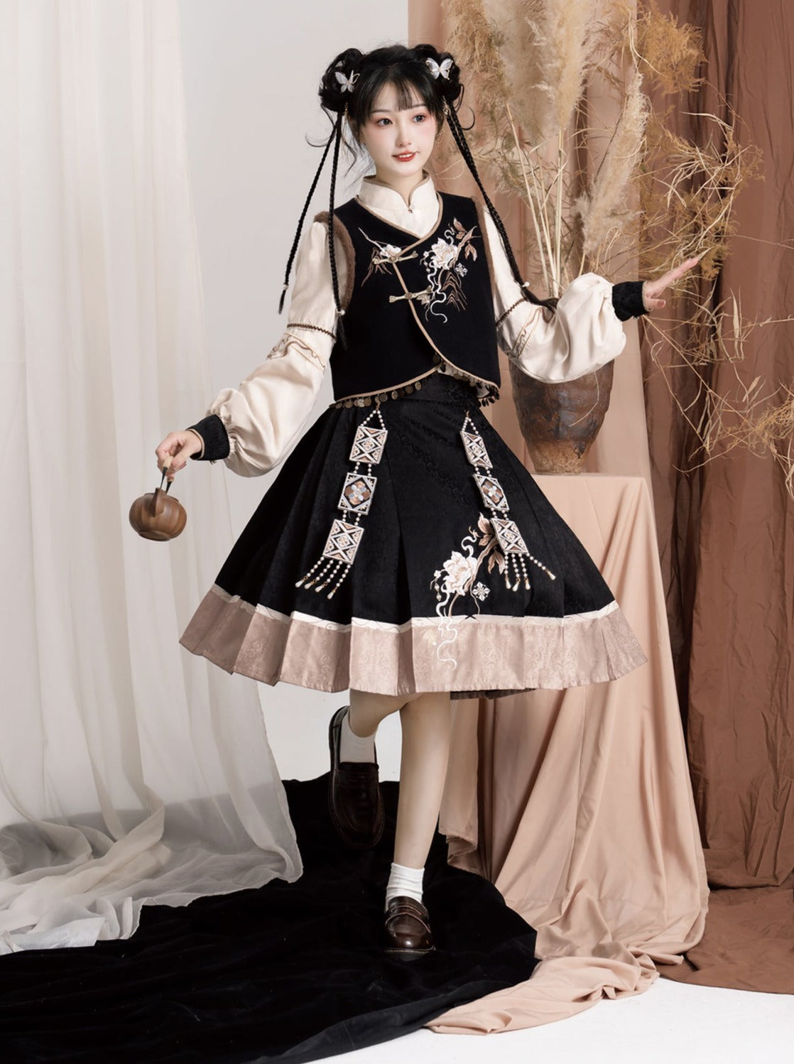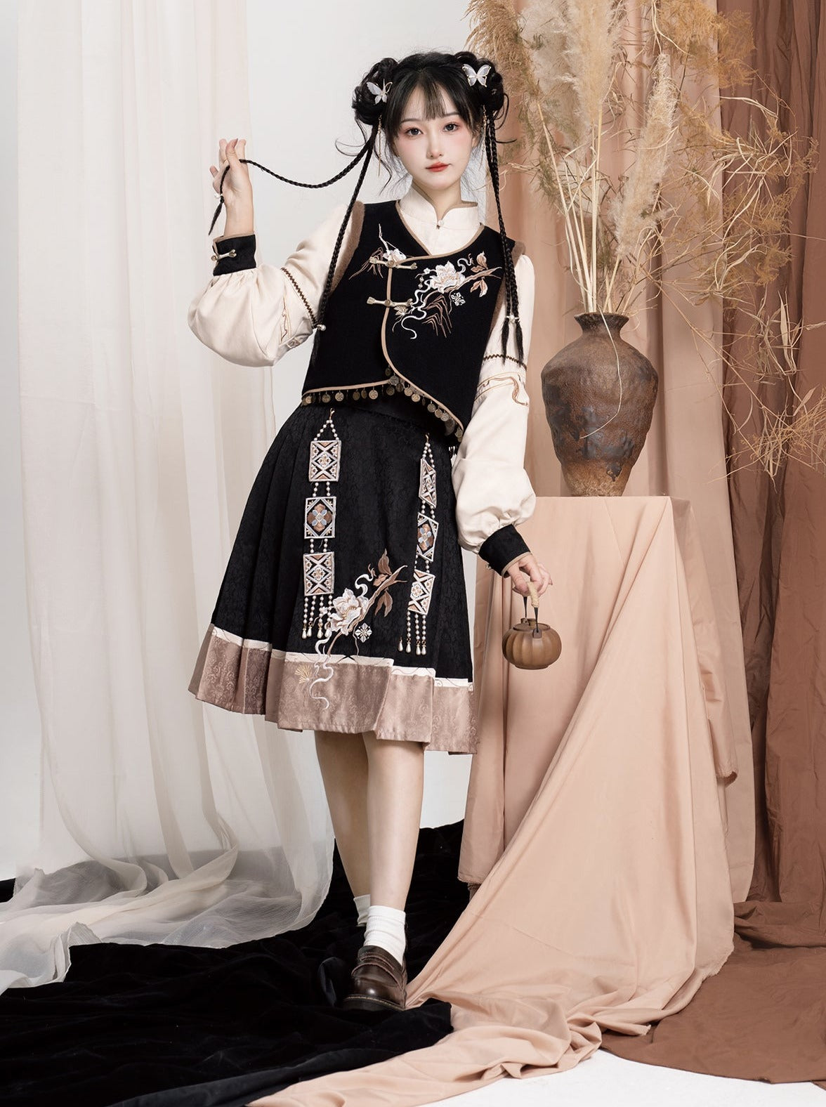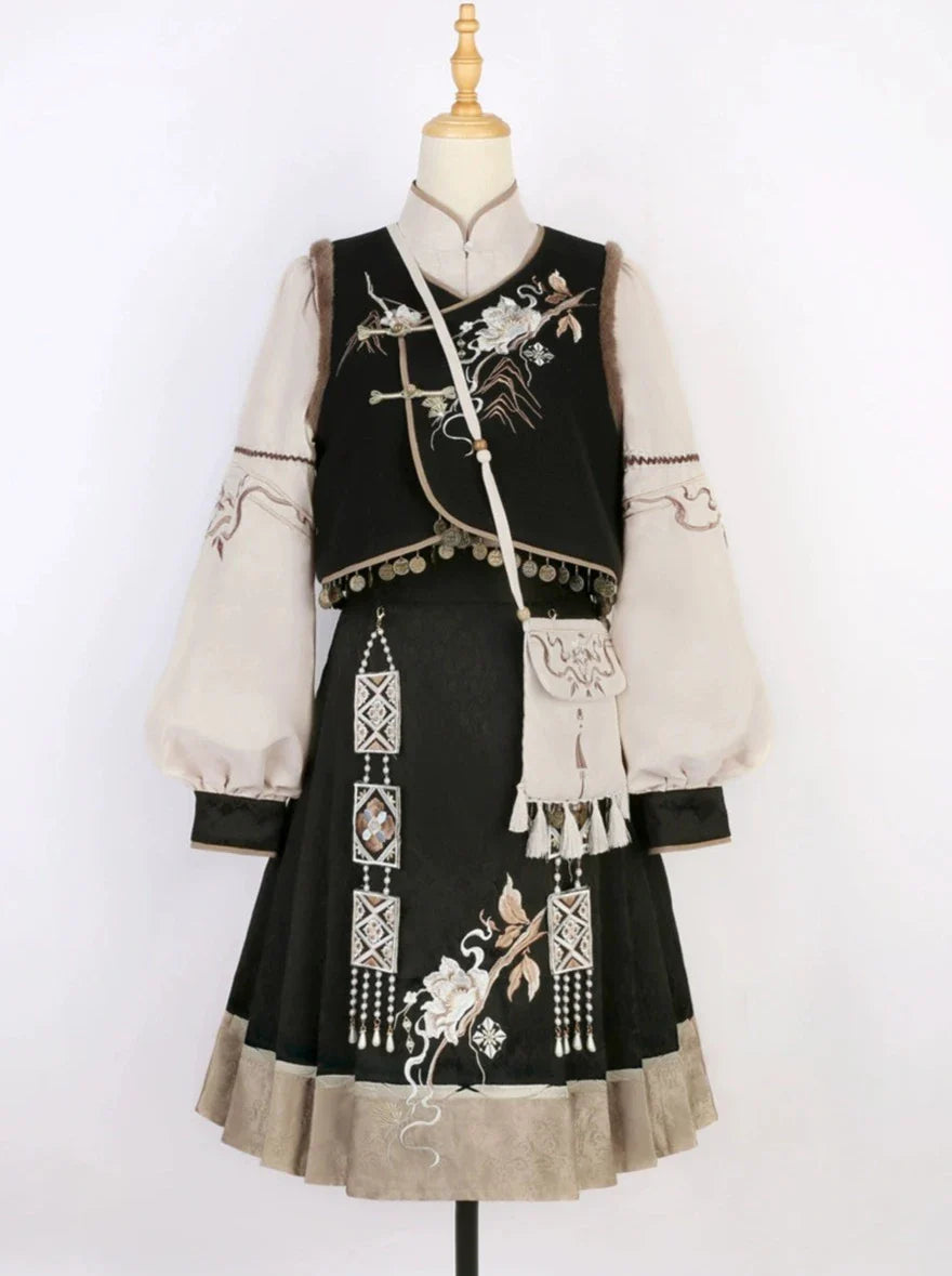 エキゾチックプラスブラウスベストフラワースリーブバッグショルダーバルーンフレアスカート